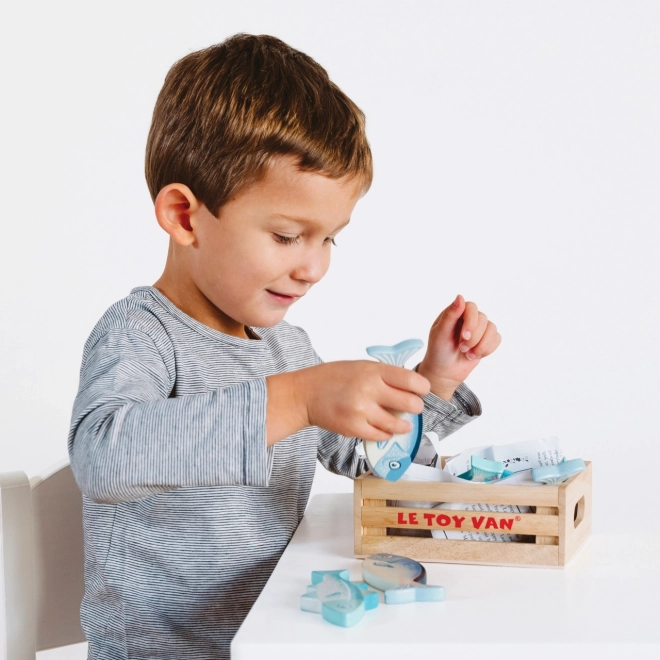 Táto drevená debnička s rybičkami je perfektná pre hru na role a vzdelávanie o rôznych typoch potravín. Podporuje zdravé stravovacie návyky a je skvelým doplnkom každej detskej kuchynky či predajného stánku.