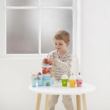 - Mixér s odnímateľnou nádobou, 6 ks krájateľného ovocia na suchý zips, drevený nožík, 2 poháre so slamkami a zdobením
