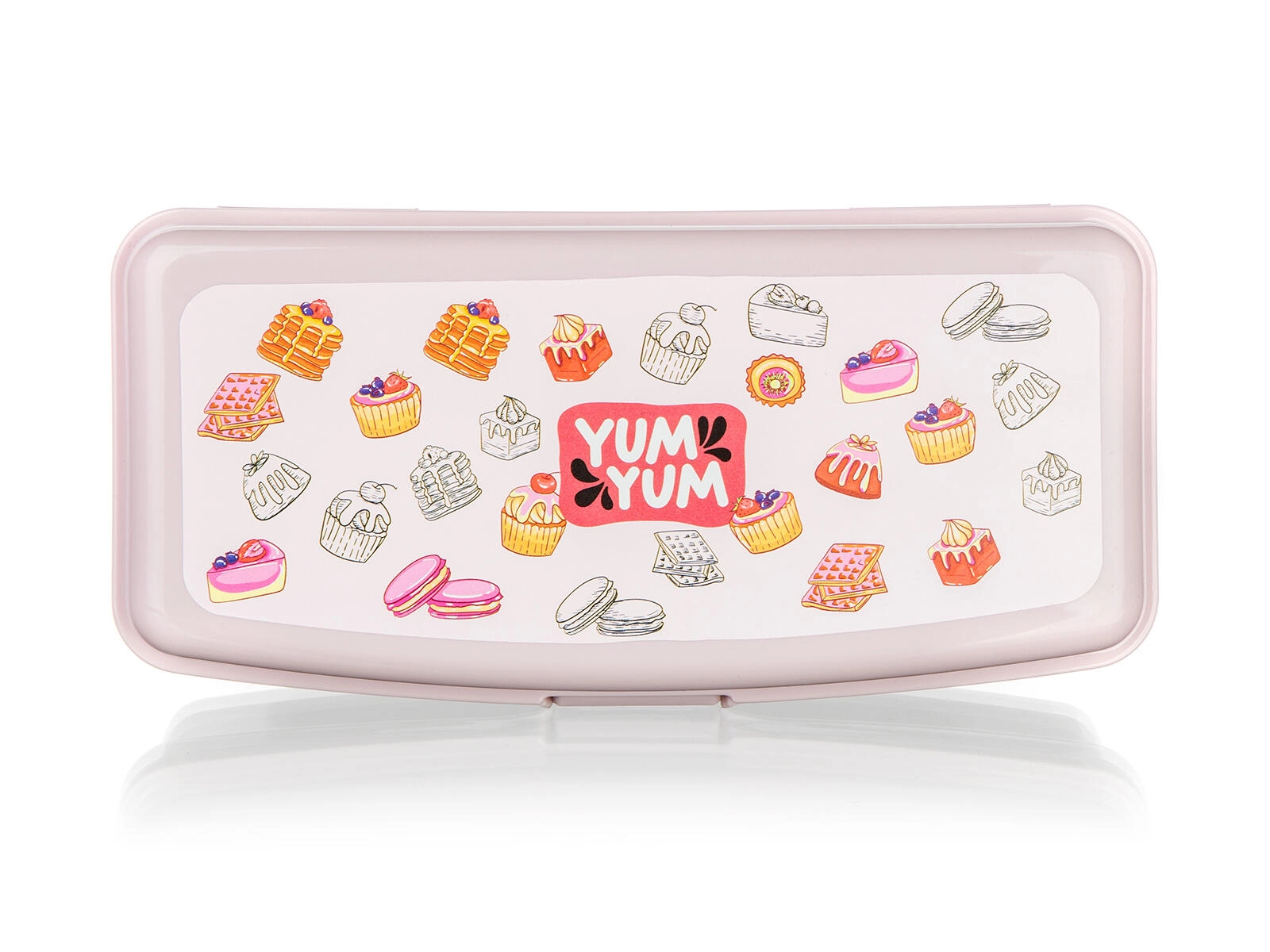 Štýlový desiatový box s roztomilým motívom YUM je skvelou voľbou pre deti aj dospelých. Vďaka kompaktným rozmerom 20 × 9,5 × 5,5 cm sa zmestí do školskej aktovky či batohu a poskytne dostatok miesta na pečivo, ovocie aj malé pochúťky. Pevný klipový uzáver zaistí, že obsah zostane na svojom mieste po celý deň.