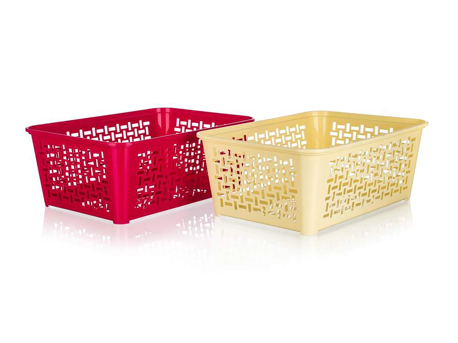 Praktický plastový košík s rozmermi 35,8 × 25,6 × 14 cm je ideálny na prehľadné ukladanie v domácnosti aj kancelárii. Vďaka možnosti vložiť menší košík 24,7 × 14,7 cm naprieč vzniká medzupodlažie pre lepšiu organizáciu priestoru. Ľahký, stohovateľný a odolný košík v mixe farieb uľahčí triedenie hračiek, potravín, drobností aj kancelárskych potrieb.