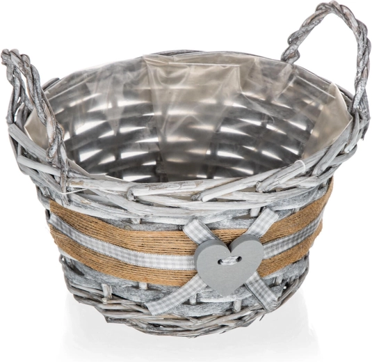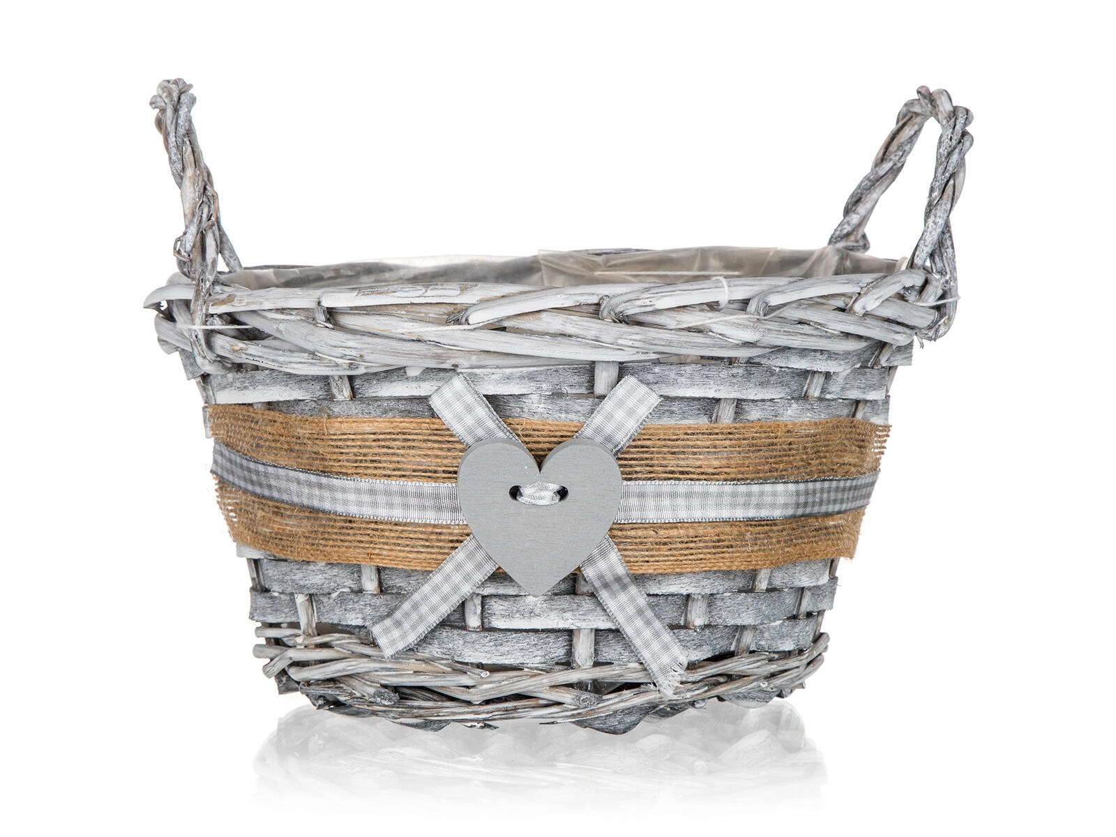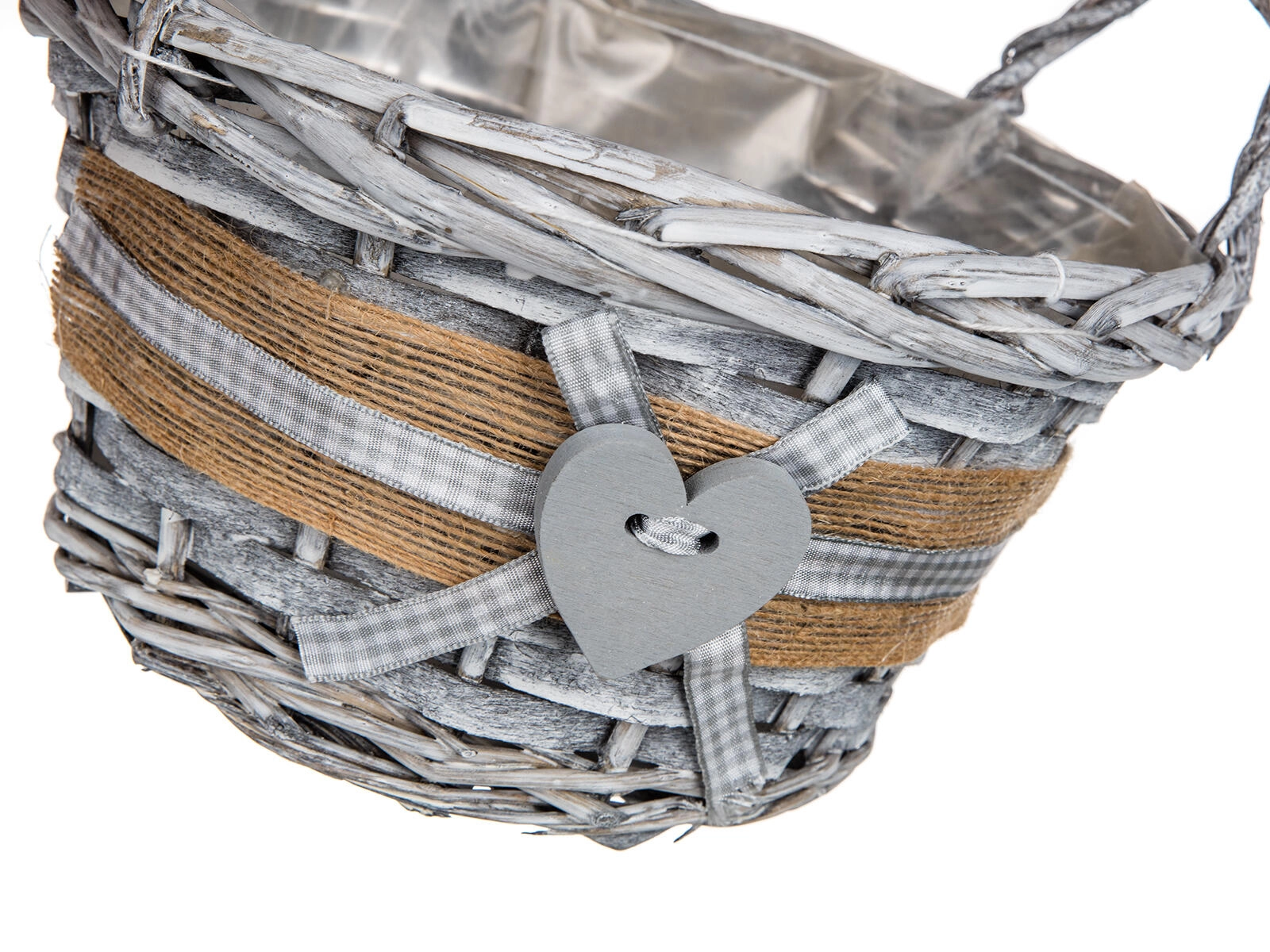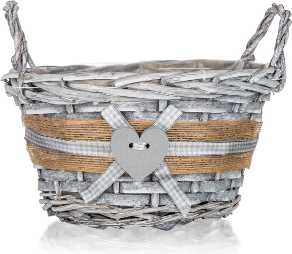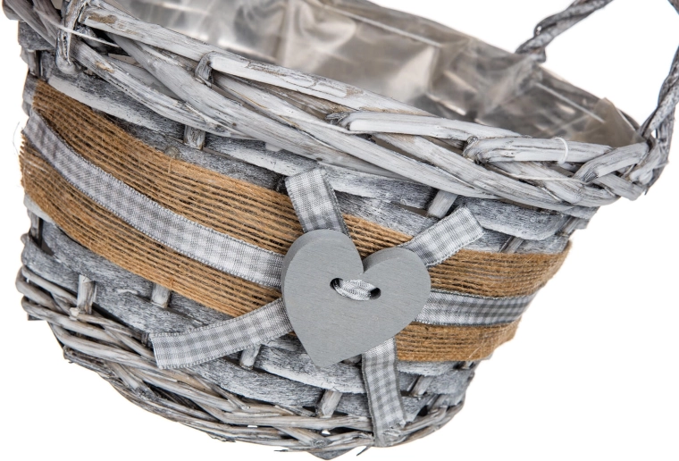 Jutový lem, kockovaná stužka a drevené srdce dodávajú košíku romantický, vidiecky vzhľad vhodný do každého interiéru.