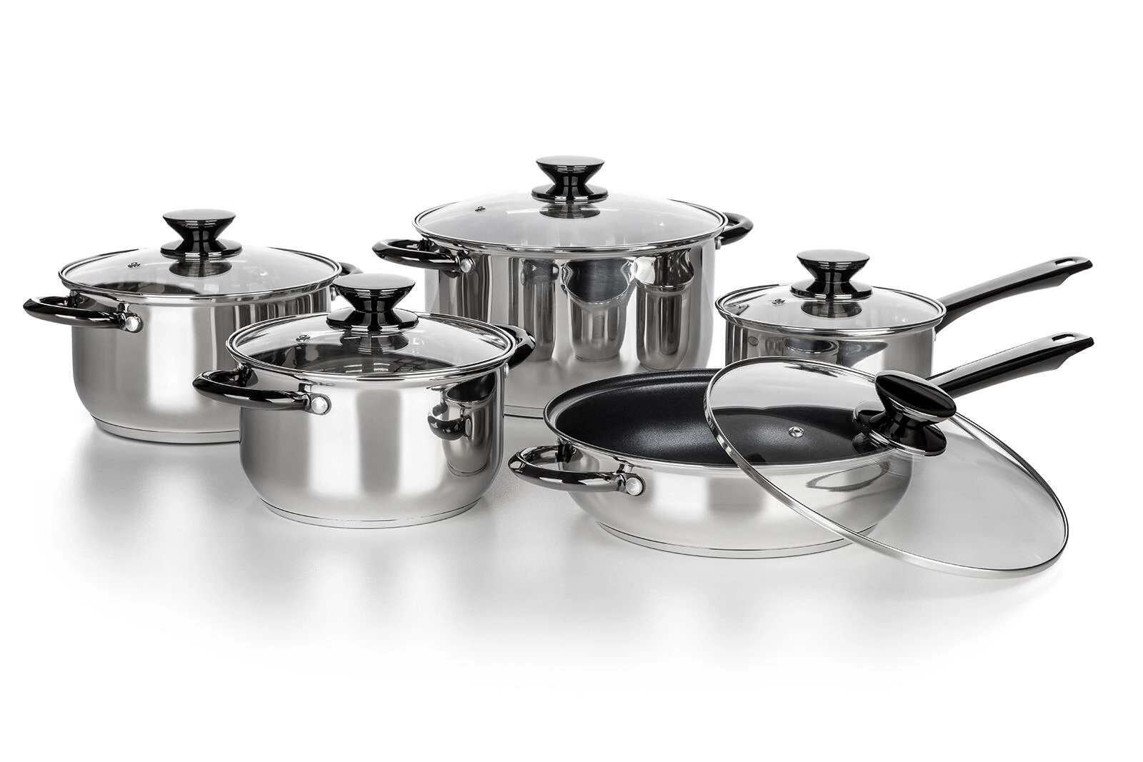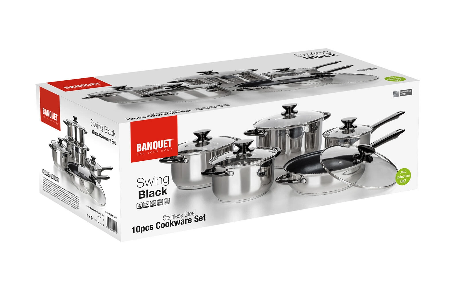 Kompletná 10-dielna súprava riadu SWING Black z kvalitnej nerezovej ocele na každodenné varenie. Obsahuje hrnce, kastról a panvicu s nepriľnavým povrchom, všetky s odolnými sklenenými pokrievkami s otvorom na paru. Vhodná na všetky typy sporákov vrátane indukcie, s lesklou úpravou a elegantnými medenými detailmi. Jednoduchá údržba, možno umývať v umývačke.