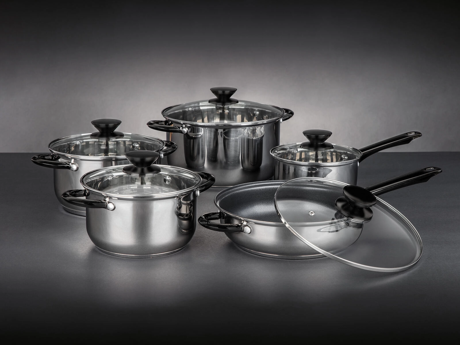 - Kastról 16 × 9 cm s pokrievkou; hrniec 18 × 10,5 cm s pokrievkou; hrniec 20 × 11,5 cm s pokrievkou; hrniec 24 × 13,5 cm s pokrievkou; panvica 24 × 6,5 cm s nepriľnavým povrchom a pokrievkou