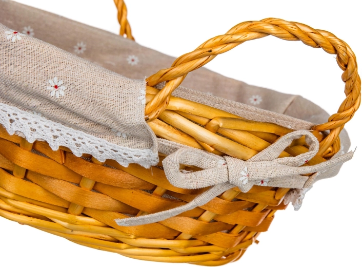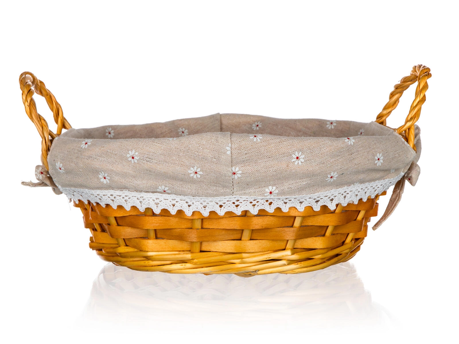 Bavlnená výstelka s drobnými kvetmi a čipkovým lemom dodáva košíku romantický vzhľad a chráni dekorácie vo vnútri.