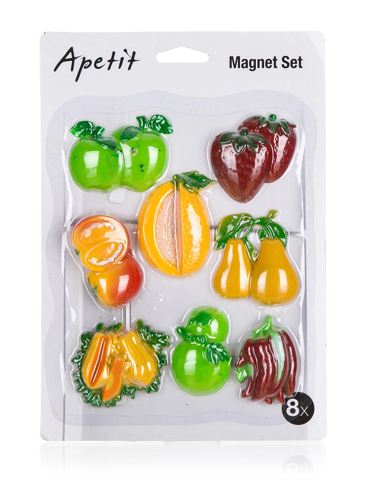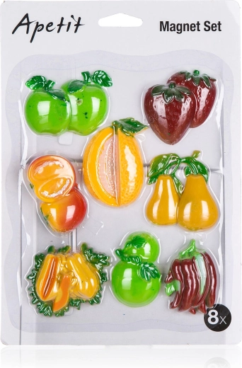 Štýlová sada magnetiek APETIT v balení po 8 kusoch s motívmi ovocia a zeleniny oživí každú chladničku či magnetickú tabuľu. Ponúka nielen dekoratívny vzhľad, ale aj praktické využitie – ideálna na pripnutie receptov, odkazov či nákupných zoznamov.