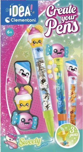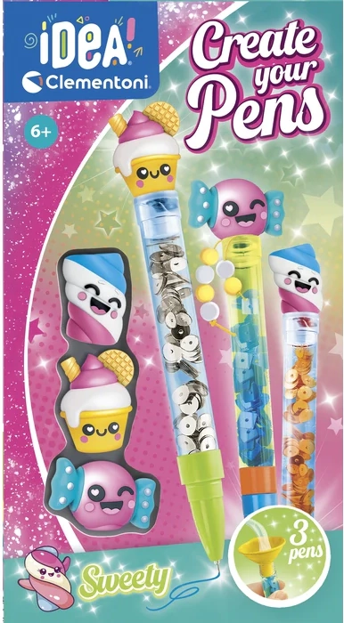 Vytvorte si vlastné štýlové perá s hravými motívmi sladkostí vďaka sade CLEMENTONI IDEA. Balenie obsahuje všetko potrebné na výrobu 3 originálnych pier – priehľadné telá s plávajúcimi trblietkami a ozdobami vo vode, farebné atramentové náplne a rozkošné gumové postavičky. Súčasťou je aj stojan s lievikom na jednoduché plnenie, takže tvorenie je čisté, zábavné a podporuje kreativitu a zručnosť.