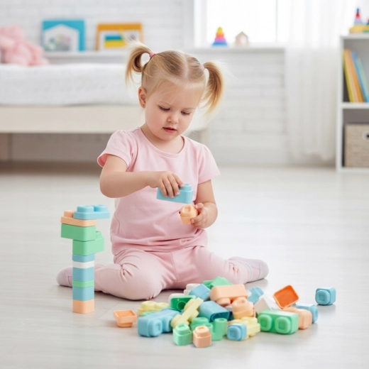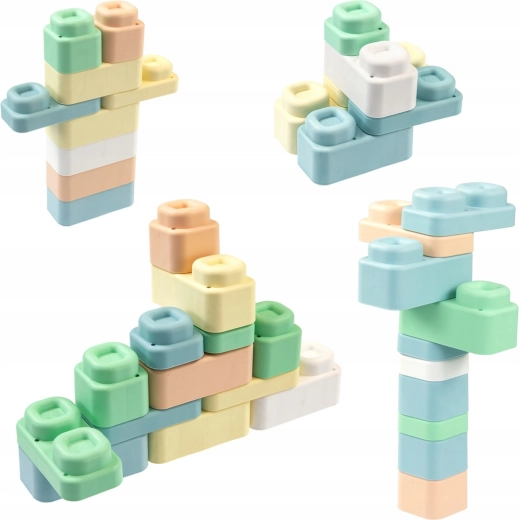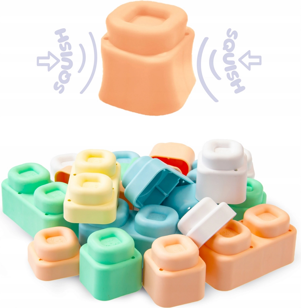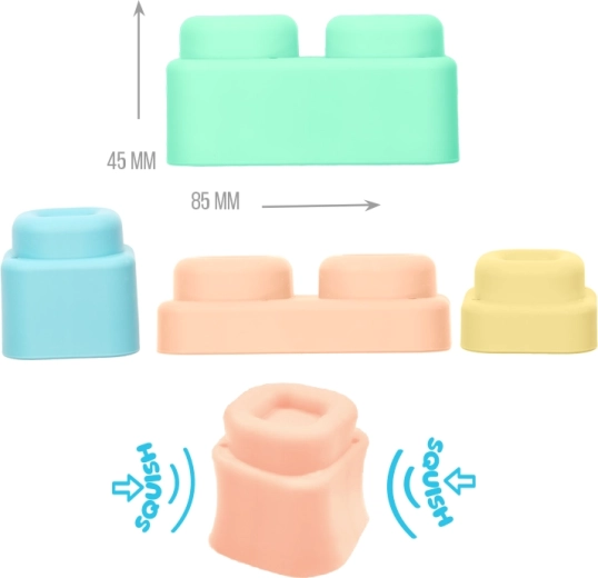 Materiál je mäkký, pružný a certifikovaný, takže deti môžu kocky aj podložky bezpečne stláčať, hrýzť alebo hádzať bez rizika poranenia. Diely sa dajú ľahko spájať a rozdeľovať, čo posilňuje jemnú motoriku, koordináciu ruka–oko a samostatnosť pri hraní.