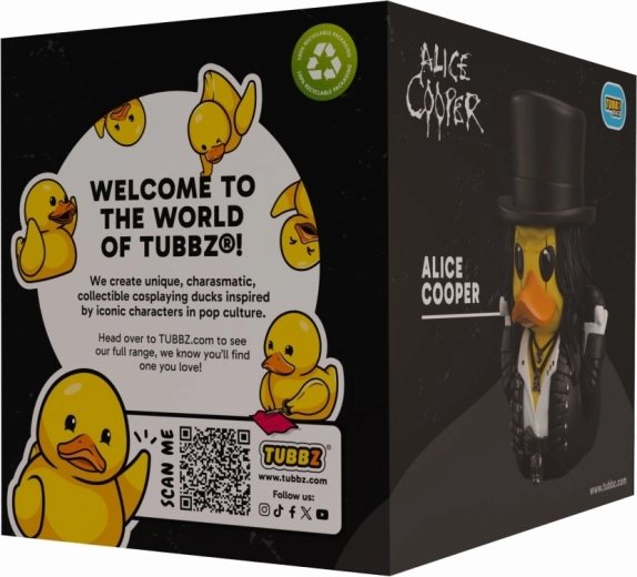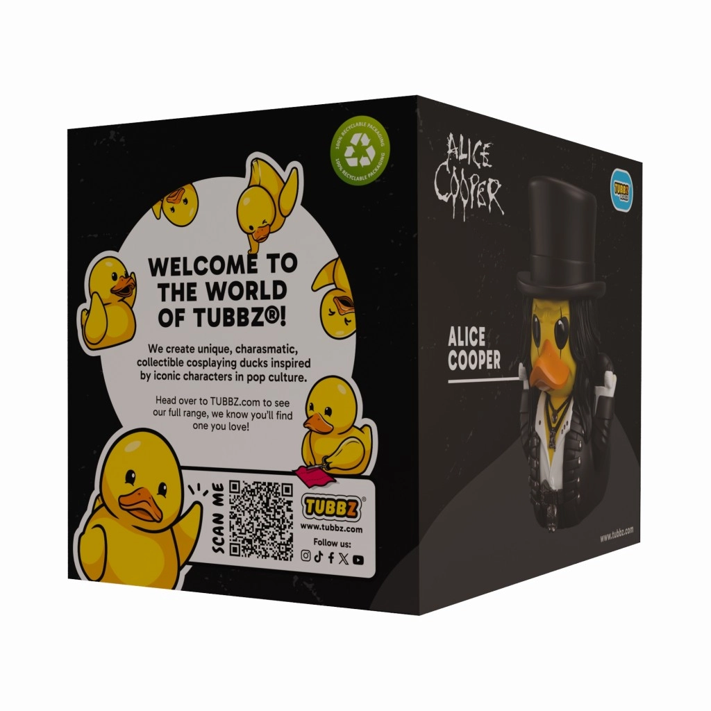 Zberateľská káčička Tubbz inšpirovaná legendárnym rockerom ALICE COOPER prináša ikonický čiernobiely make-up, temný outfit a kvalitné vinylové spracovanie. Ideálna ako licencovaný darček, dekorácia aj zberateľský kúsok pre fanúšikov rocku.