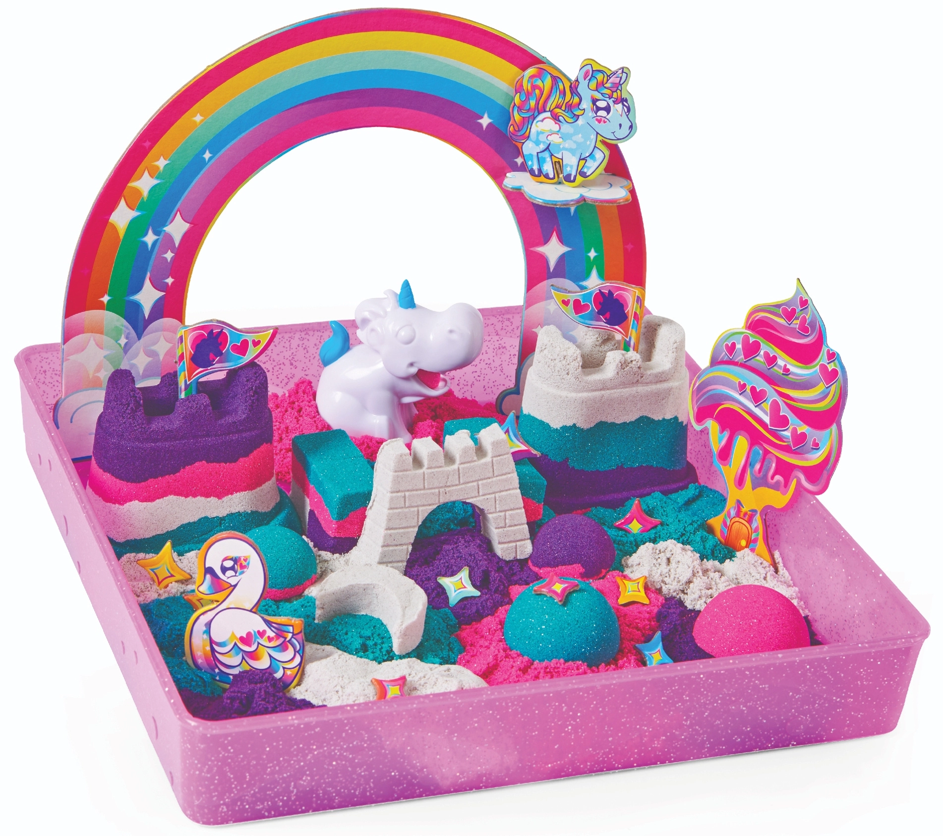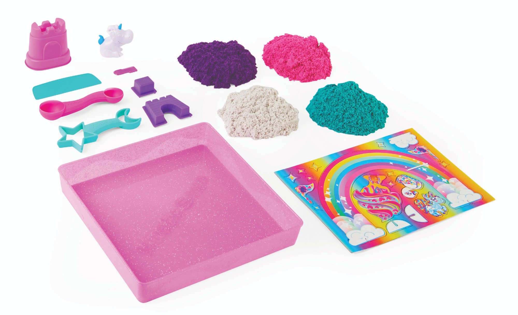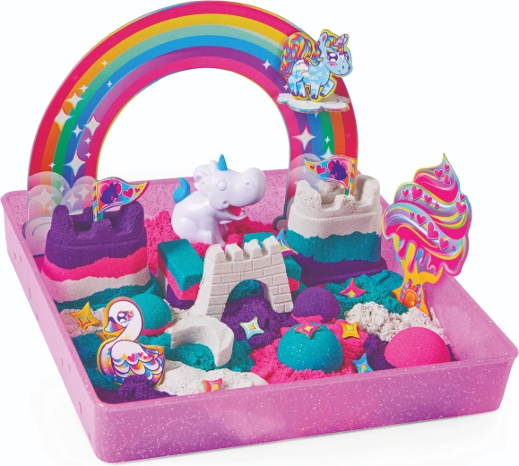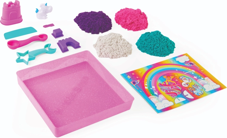 Vstúpte do rozprávkového sveta jednorožcov a postavte si vlastné kráľovstvo z kinetického piesku. V balení nájdete približne 0,9 kg piesku v štyroch farbách – fialovej, ružovej, tyrkysovej a bielej – so subtílnym leskom, ktorý dodá každému výtvoru čarovný vzhľad.