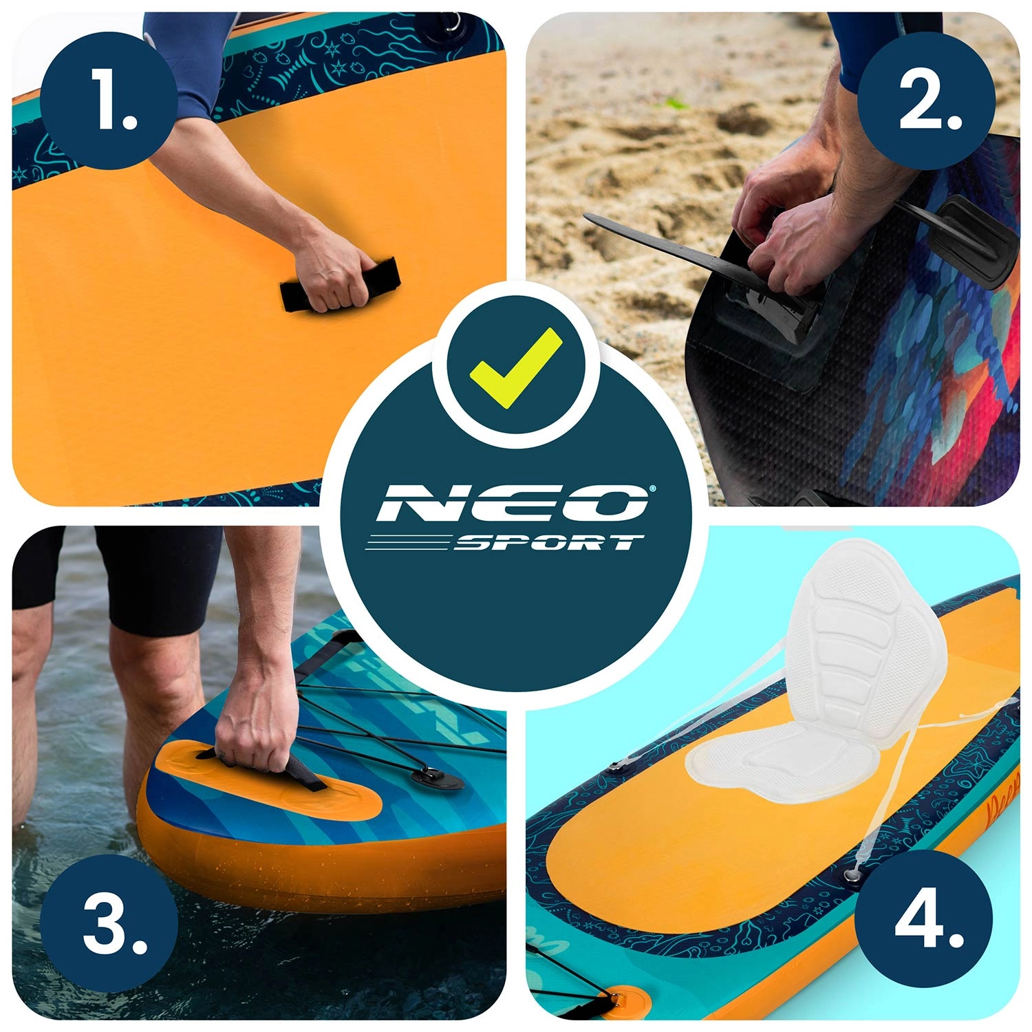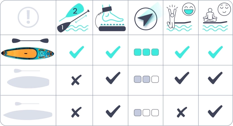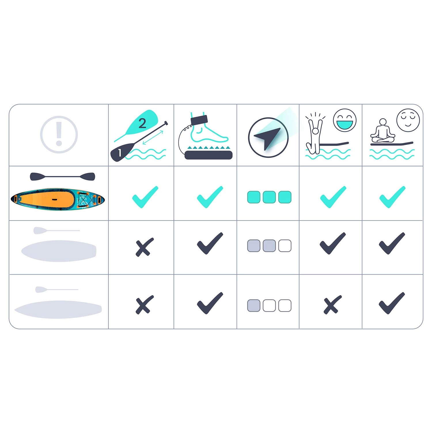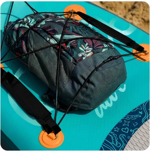 V prednej časti je praktická elastic cargo sieť na batoh, bundu či fľašu. Nastaviteľné hliníkové pádlo (162–210 cm) sa rýchlo uzamkne pákovým zámkom a prispôsobí sa postave aj štýlu pádlovania. Dvojčinná pumpa s manometrom urýchli nafúknutie a umožní presnú kontrolu tlaku. Leash s otočným kĺbom sa nezamotáva a drží vás v bezpečí. Trojica úchopov uľahčí prenášanie na pláž aj do auta.
