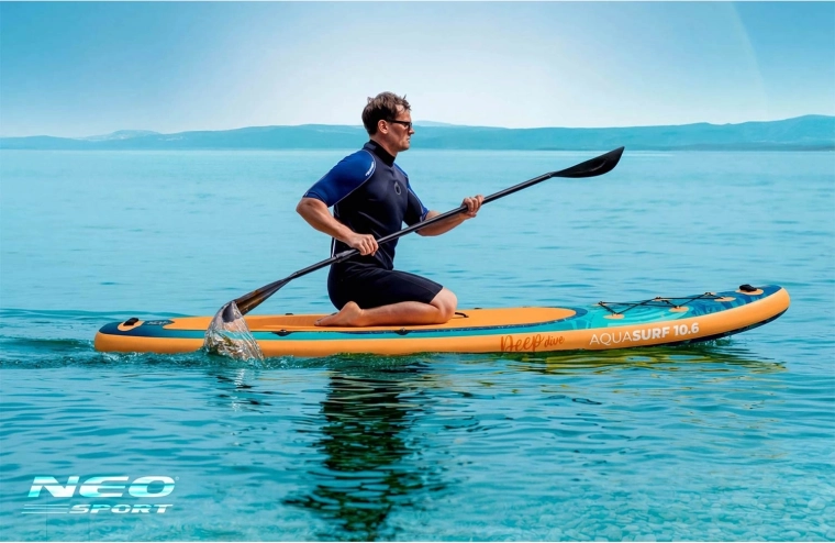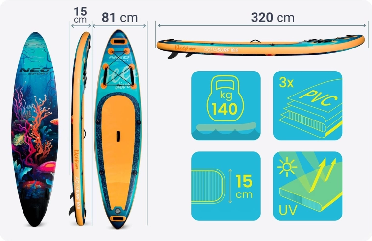 Nafukovací SUP Aquasurf 10'6 (320 × 84 × 15 cm) je univerzálna doska na pokojnú vodu aj menšie vlny. Vďaka hrúbke 15 cm ponúka vysokú stabilitu, zatiaľ čo protišmyková EVA pokrýva veľkú časť paluby pre bezpečný postoj aj naboso. Nosnosť do 140 kg umožní vyraziť na vodu s výbavou alebo s dieťaťom. Robustné 3-vrstvové PVC s technológiou Drop Stitch Light a UV odolná povrchová úprava predlžujú životnosť, zosilnené hrany zvyšujú odolnosť proti nárazom.