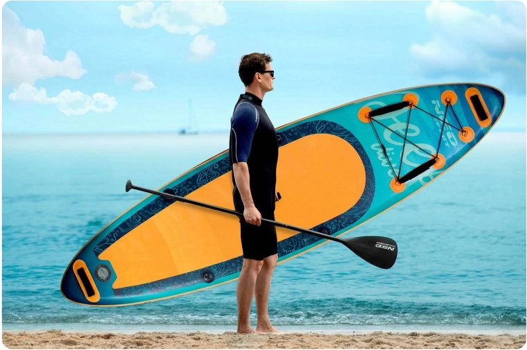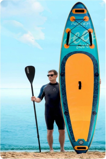V balení nájdete paddleboard, odnímateľnú plutvu, nastaviteľné pádlo, dvojčinnú pumpu s manometrom, špirálový leash, opravnú sadu a odolný batoh. Ľahko zbalíte, prenesiete a vyrazíte.