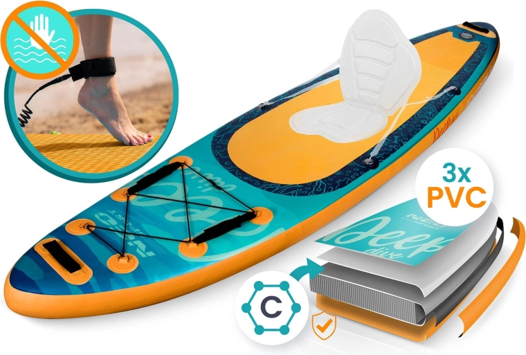 Súčasťou je všetko pre okamžitý štart: pádlo, pumpa, leash, odnímateľná plutva pre lepšiu smerovú stabilitu, opravná sada a priestranný batoh z odolného materiálu. Ideálne na rekreáciu, fitness, jogu aj pohodové výlety po jazerách a pokojných tokoch.