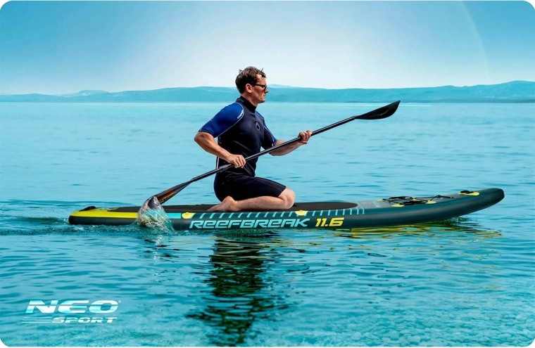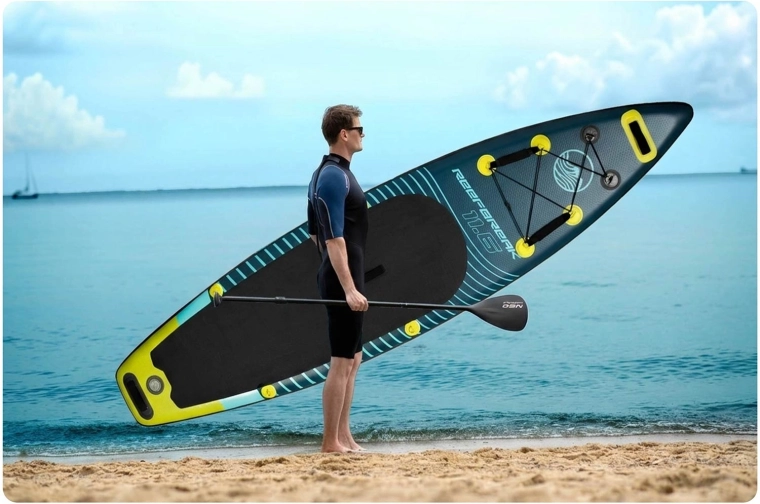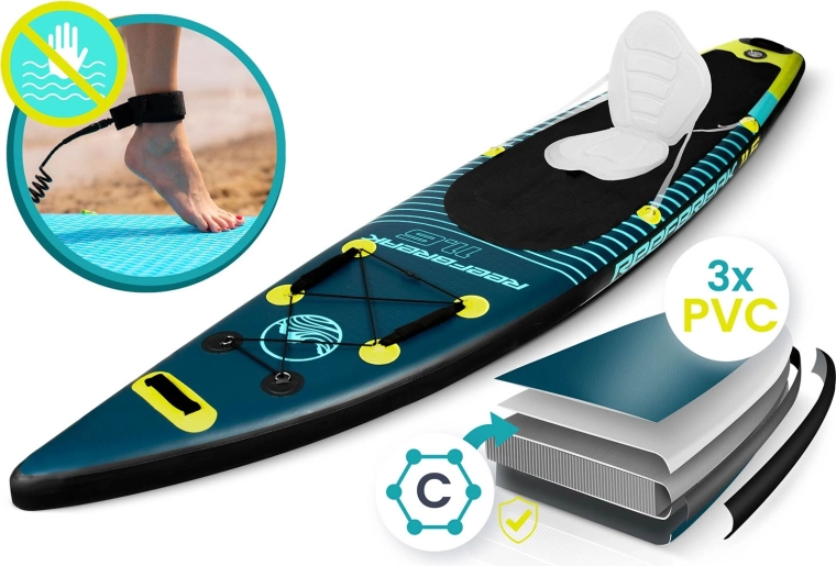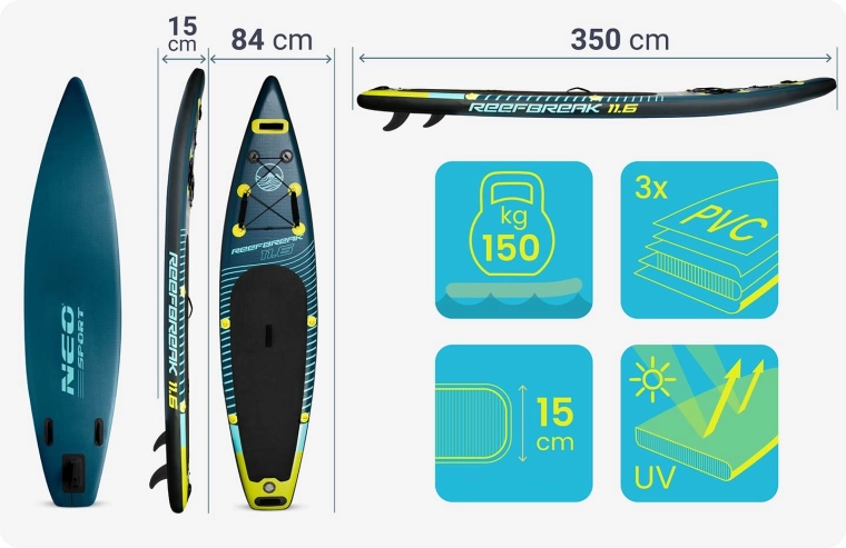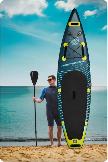REEFBREAK 11'6 kombinuje istotu a pohodlie s ľahkou a obratnou konštrukciou. Trojvrstvové PVC s technológiou Drop Stitch Light a zosilnené boky zaisťujú výbornú tuhosť, dlhú životnosť a odolnosť voči UV žiareniu. Protisklzová EVA deck podložka poskytuje pevný krok aj s mokrými chodidlami, zatiaľ čo 3 plutvy dodávajú smerovú stabilitu a ľahké manévrovanie.