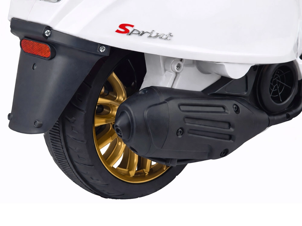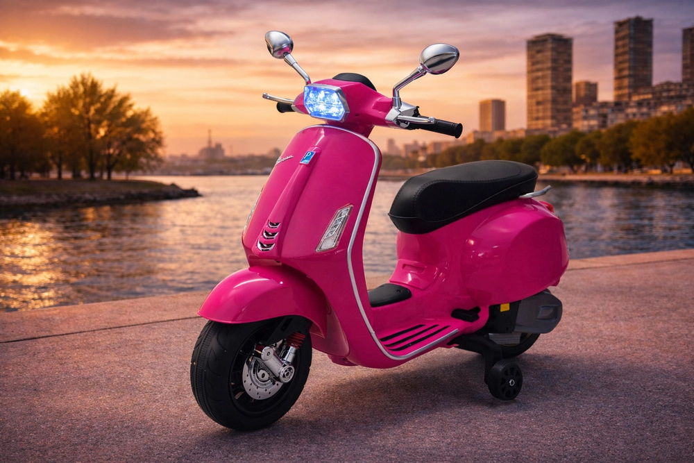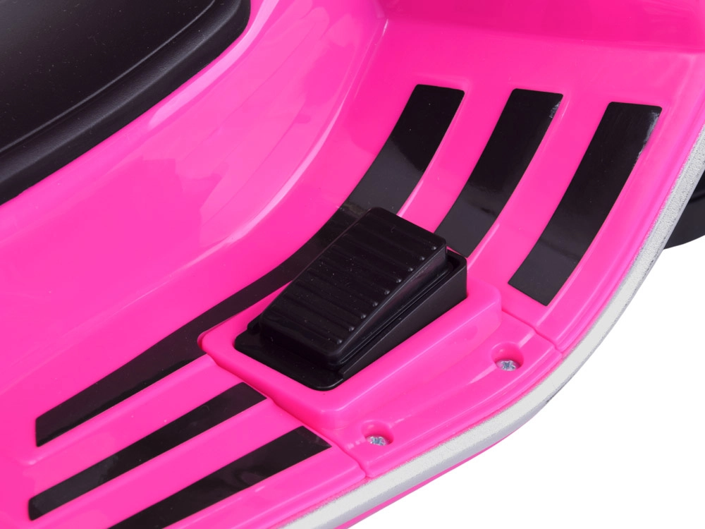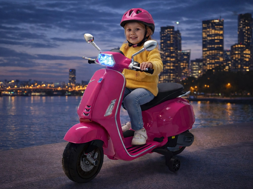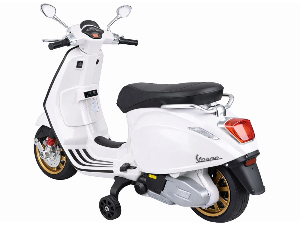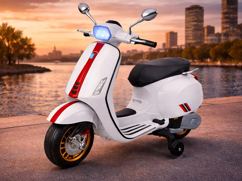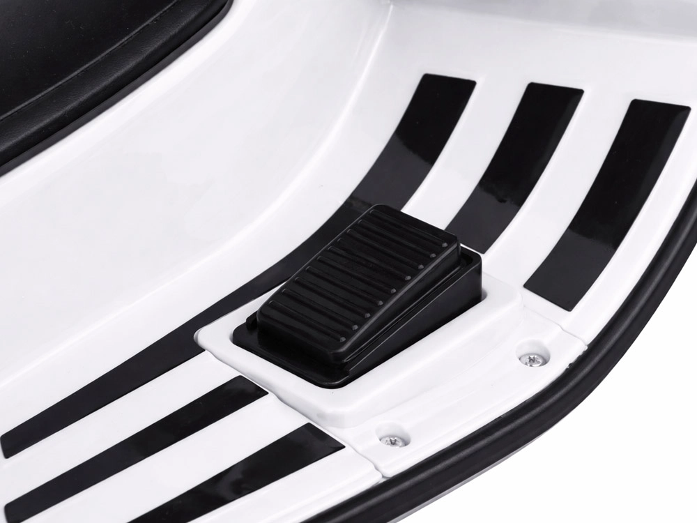 Elektrický detský skúter v štýle VESPA spája elegantný dizajn s modernými funkciami. Štartuje sa tlačidlom a simulácia zvuku motora navodí autentický zážitok z jazdy. Výkonný pohon 2 × 12 V / 25 W a akumulátor 12 V / 4,5 Ah zabezpečujú komfortnú a plynulú jazdu, zatiaľ čo predný svetlomet dodáva štýl aj lepšiu viditeľnosť.
