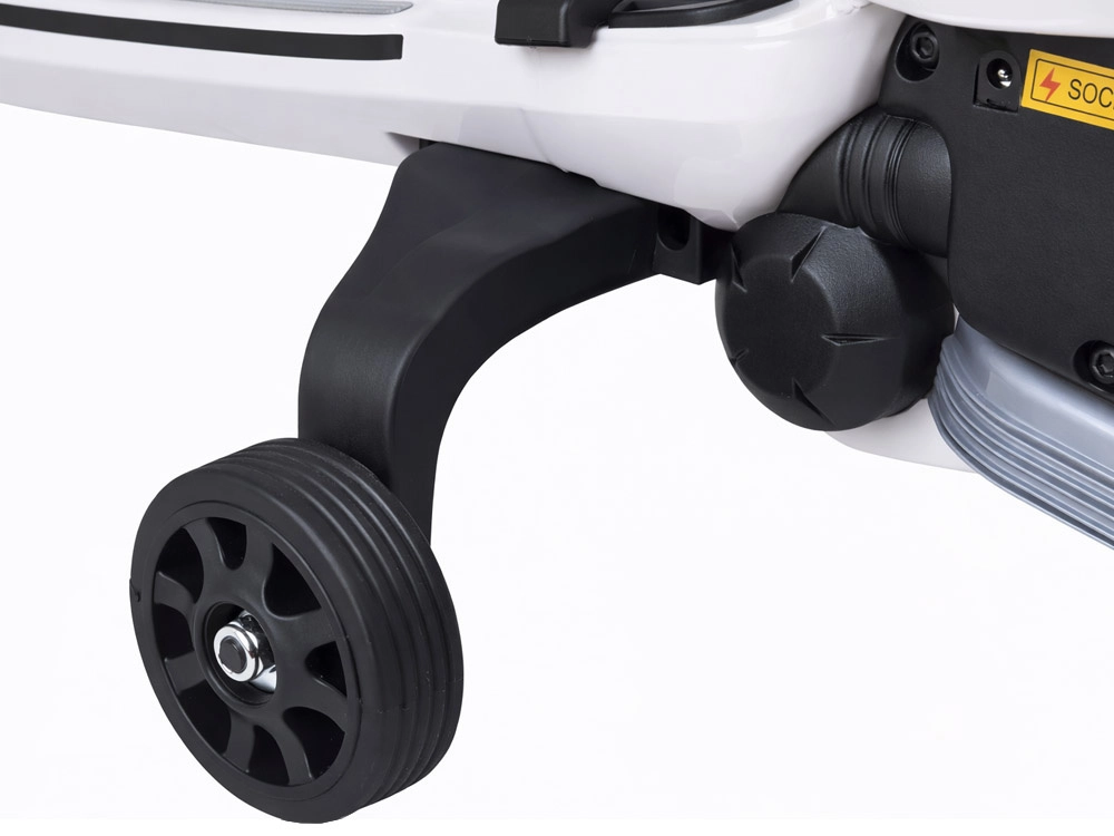 Bezpečnosť podporuje elektrická brzda, ktorá sa aktivuje po uvoľnení pedála plynu, a bočné pomocné kolieska pre stabilitu začínajúcich jazdcov. Intuitívne ovládanie s prepínačom vpred/vzad umožní deťom ľahko manévrovať. Multimediálny panel poteší rádiom FM, prednahranými pesničkami a možnosťou prehrávania z USB/SD alebo AUX.
