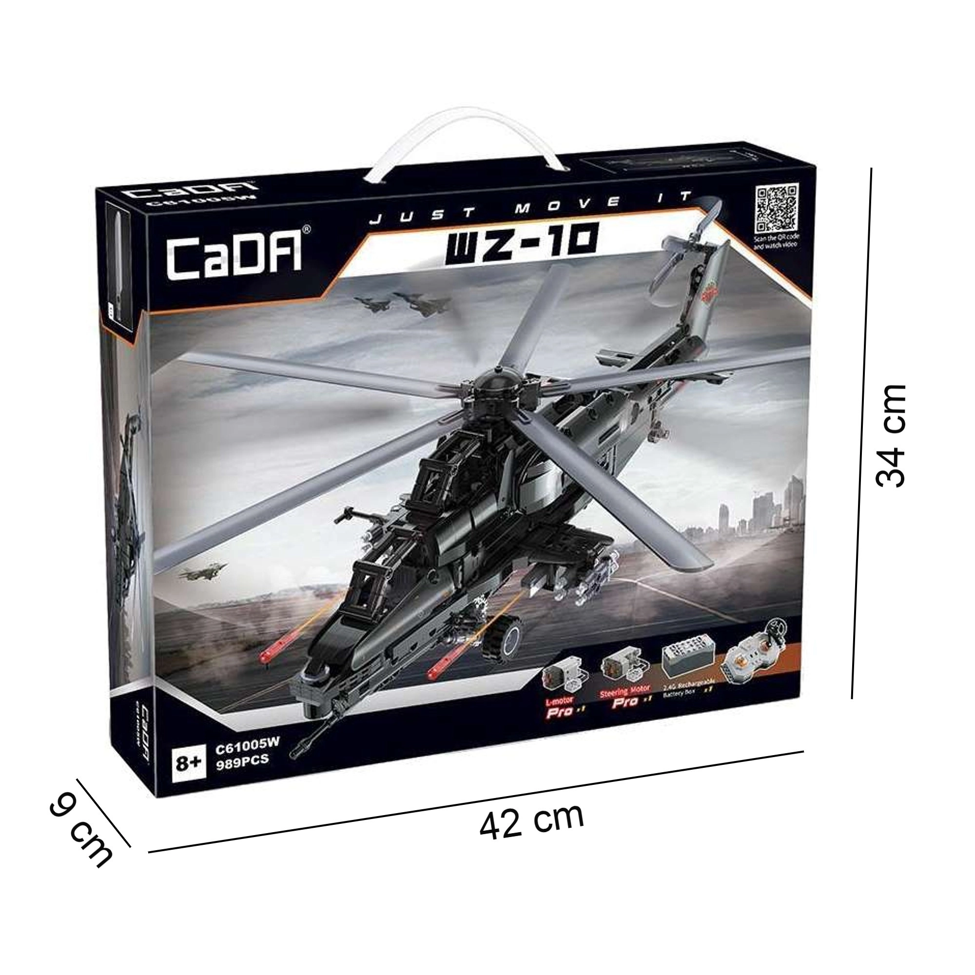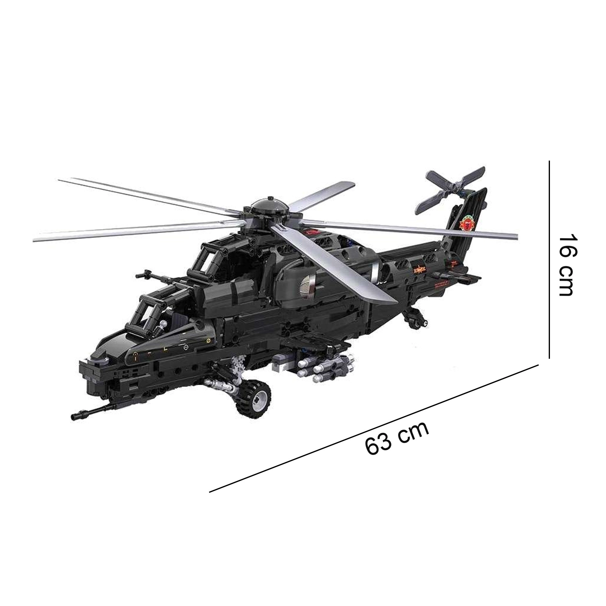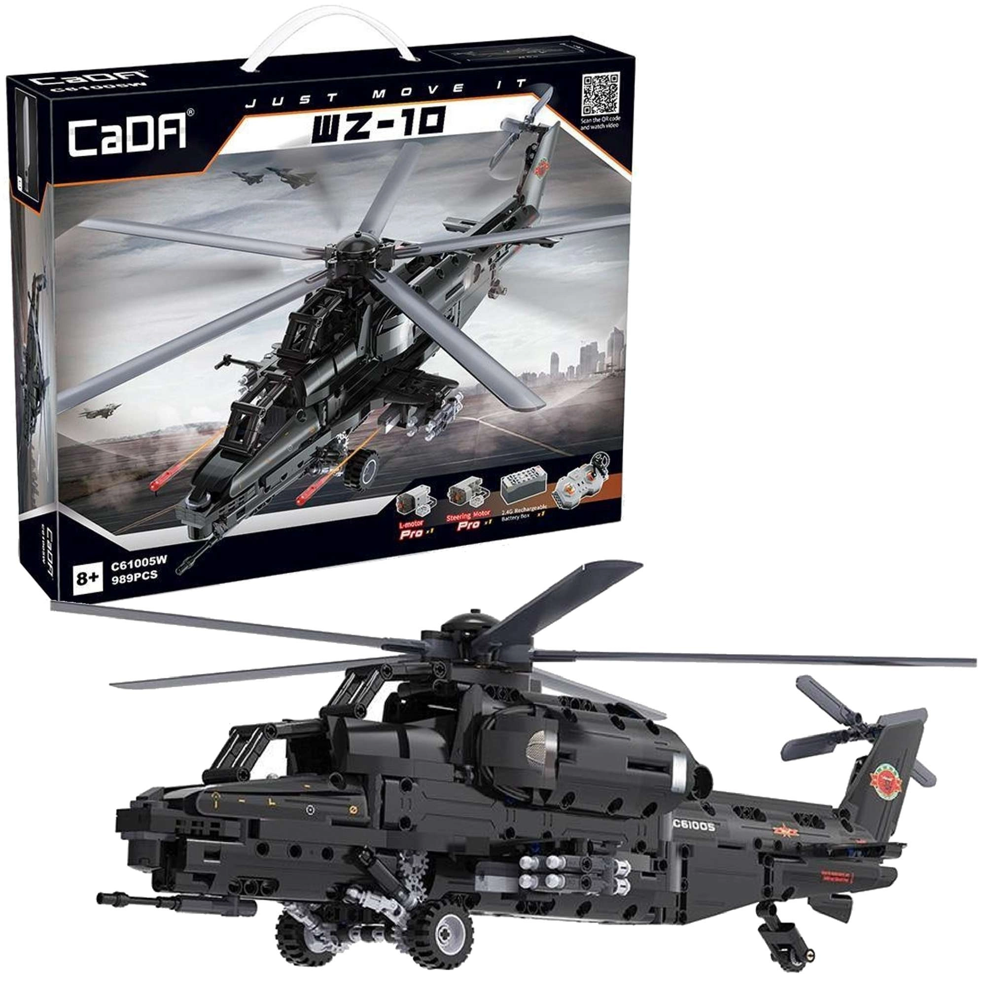 Postavte si ikonický útočný vrtuľník WZ-10 z 989 dielikov od CaDA a ovládajte ho na diaľku. Model ponúka pracujúci hlavný aj chvostový rotor, otvárateľný kokpit, funkčný vystreľovač rakiet a pohyb na kolieskach. Vďaka RC ovládaniu 2,4 GHz s dosahom cez 25 m si užijete množstvo akčnej zábavy aj precízne technické stavanie.