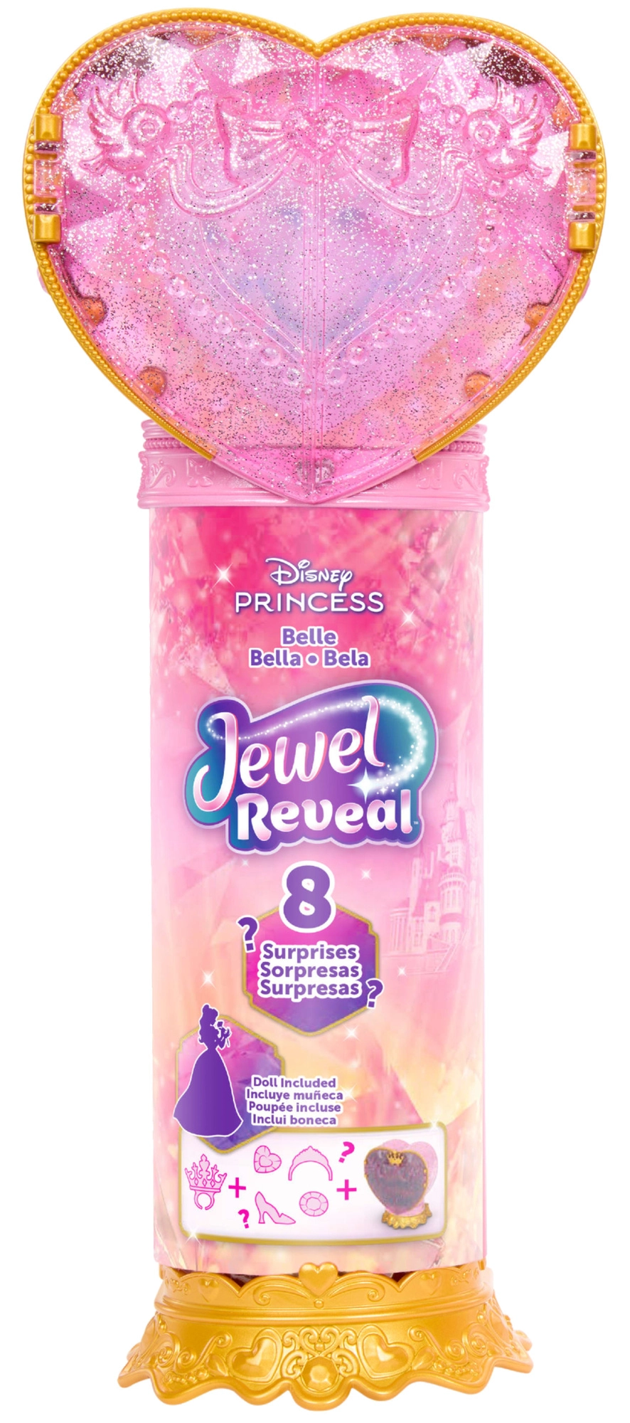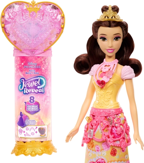 Objavte čarovnú zábavu s bábikou Disney princezná Bella zo série Jewel Reveal. Čaká na vás 8 prekvapení, trblietavé srdiečkové balenie slúžiace ako šperkovnica, štýlové doplnky (tiara, topánočky, „klenoty“) a prstienok pre dieťa. Ideálne na kreatívne prezliekanie a rozprávkové príbehy.