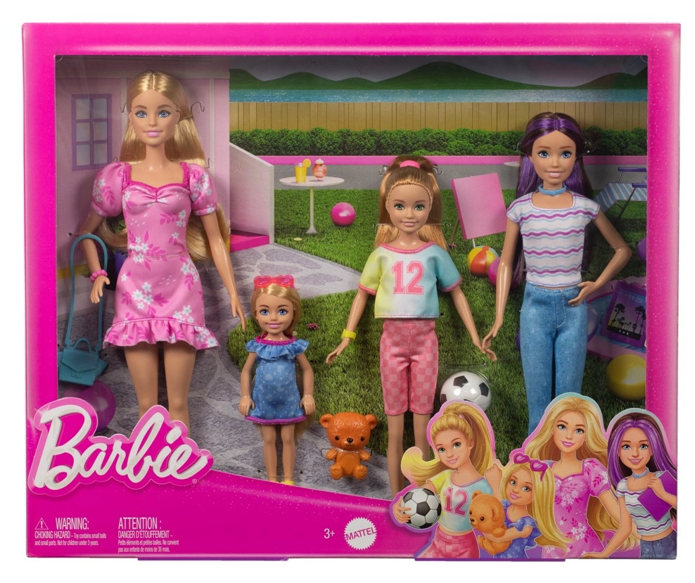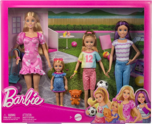 Táto pestrá rodinná sada prináša štyri rôzne postavy so svojím jedinečným vzhľadom a záujmami: elegantnú Barbie v ružových šatách, technicky zvedavú Skipper s tabletom, športovú Stacie s futbalovou loptou a roztomilú Chelsea s plyšovým medvedíkom. Každá bábika má odnímateľné oblečenie a detaily, ktoré podporujú realistickú hru.