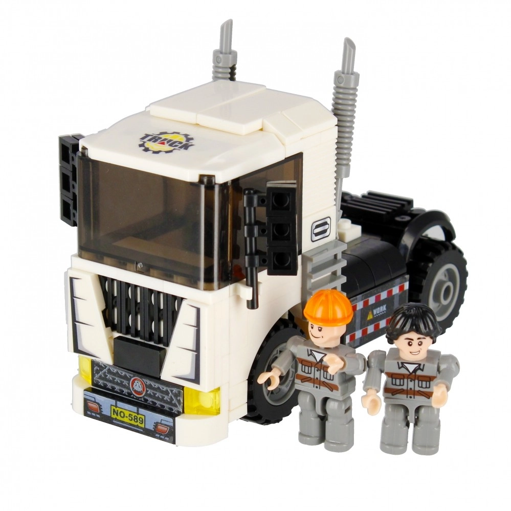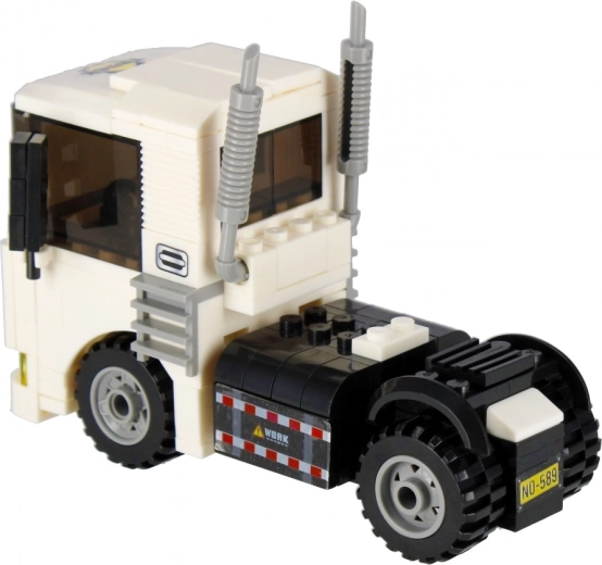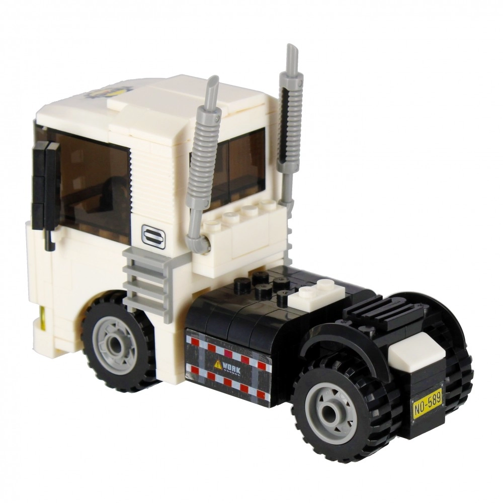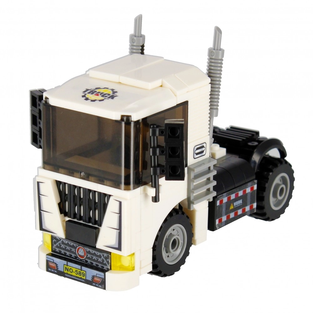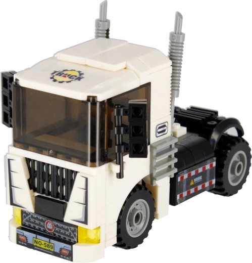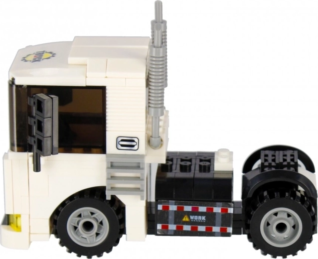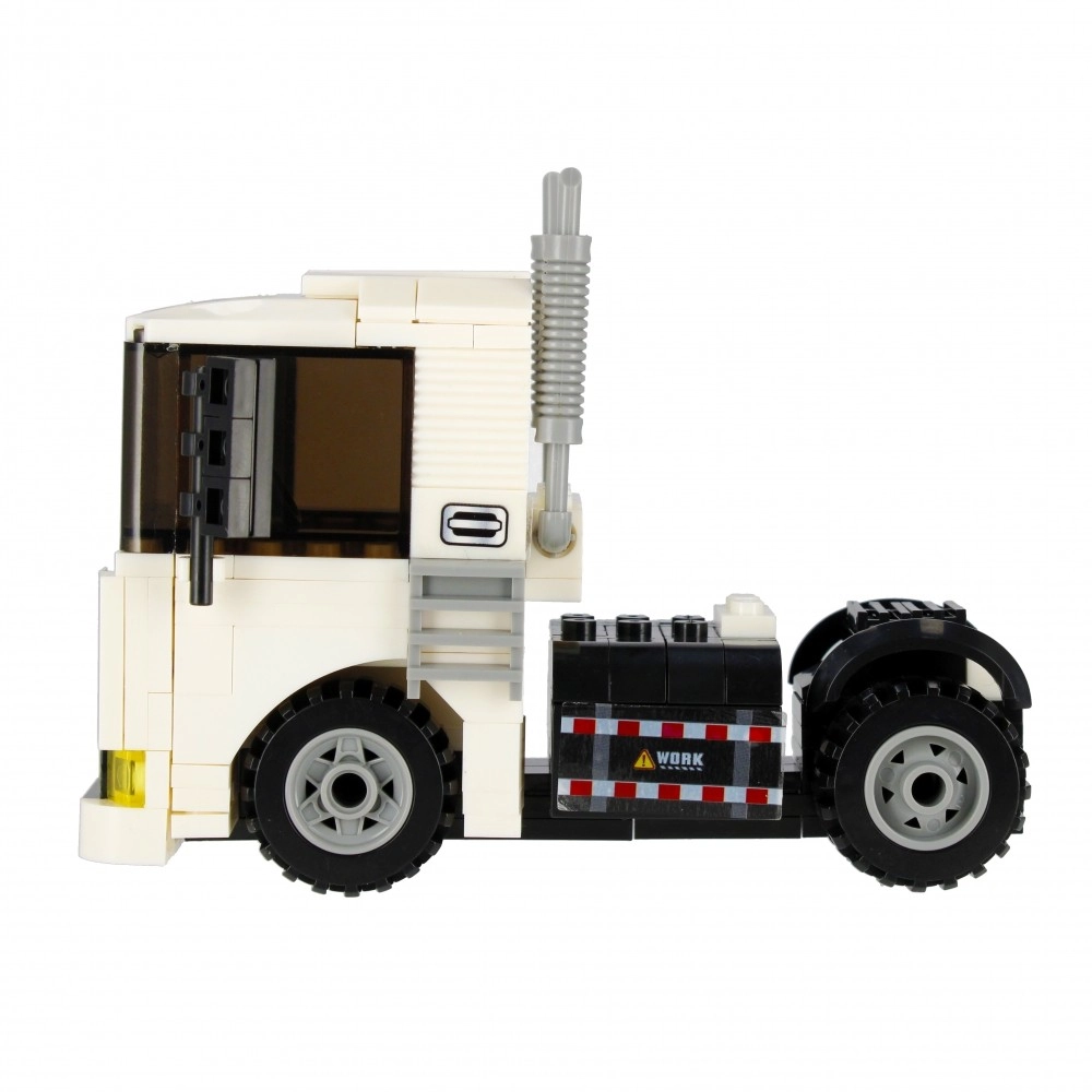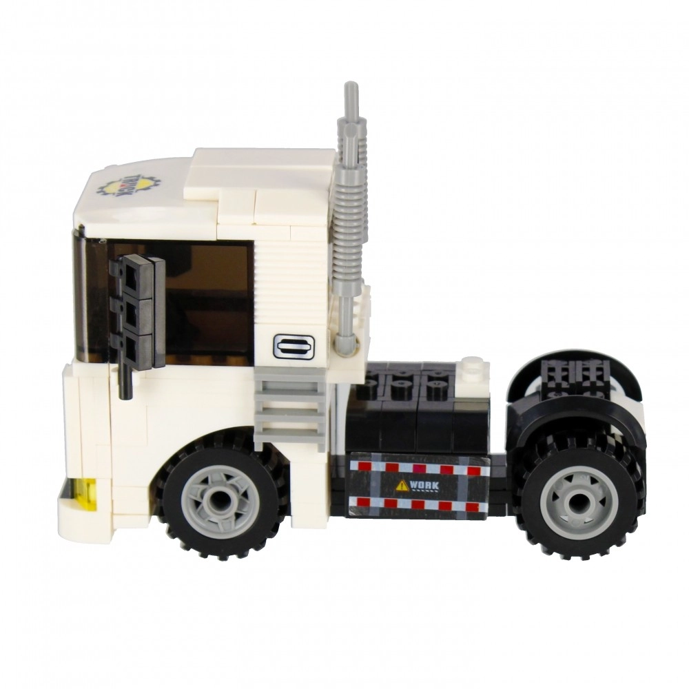 Postavte si biely ťahač s funkčnými kolesami, výfukmi a výraznou kabínou. Ideálny na prepravu aj stavebné scenáre vo vašom meste.