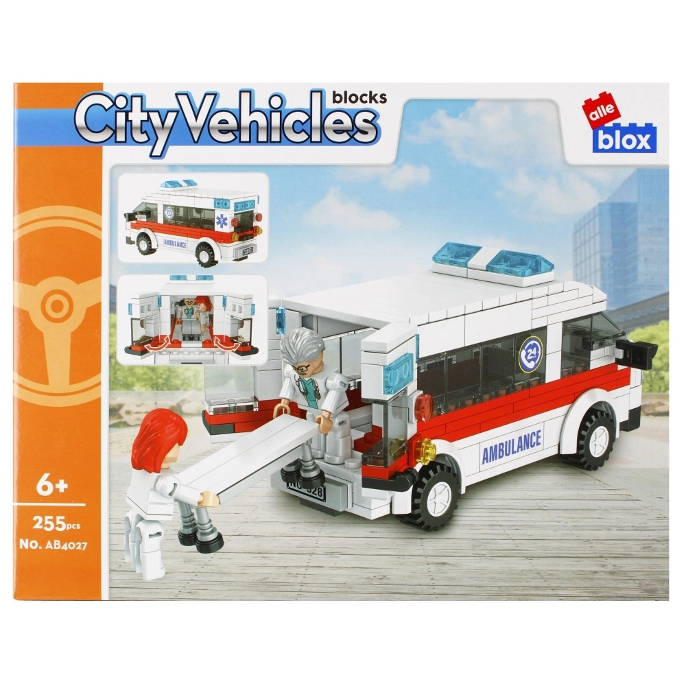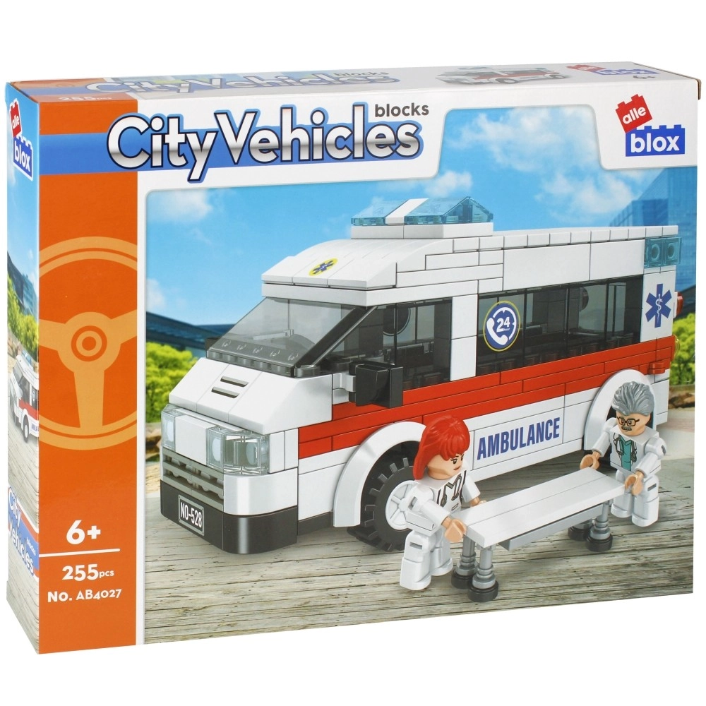 Stavebnica Alleblox City sanitka prináša deťom autentický záchranársky zážitok. Z bielych a červených kociek s potlačami AMBULANCE postavia detailné vozidlo s modrými majákmi, čírymi svetlami a funkčnými kolesami. Zadný priestor je pripravený na prevoz pacienta a do akcie vyrážate s dvojicou minifigúrok a nosidlami.