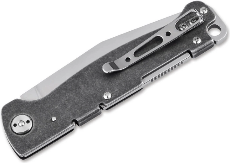 Manuálne otváranie zárezom na čepeli je intuitívne a bezpečné, o istotu v zatvorenej aj otvorenej polohe sa stará robustný zámok backlock. Celokovová rukoväť z nehrdzavejúcej ocele s tmavým stonewash povrchom je odolná proti poškriabaniu a pôsobí elegantne. Praktická vrecková spona a otvor na šnúrku rozširujú možnosti nosenia pri každodenných aktivitách.