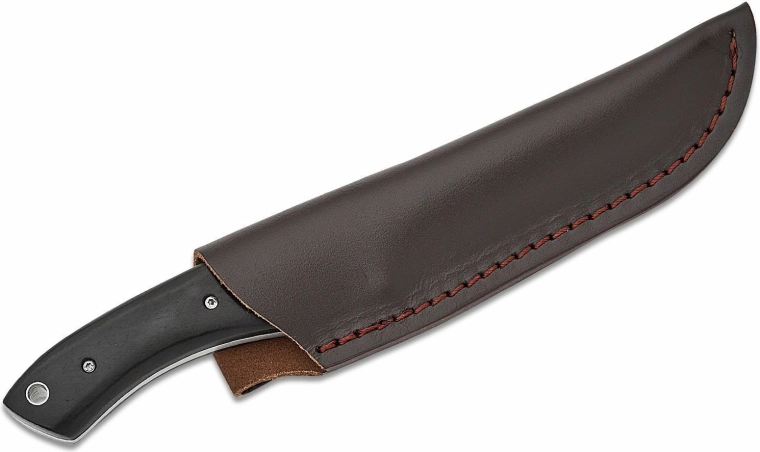 Rukoväť z ebenového dreva príjemne padne do ruky a spolu s plnou konštrukciou tang zvyšuje stabilitu pri práci. Damaškové záštity podčiarkujú luxusný vzhľad, zatiaľ čo dutý mosadzný nit umožňuje jednoduché prevlečenie poistnej šnúrky. Súčasťou je kvalitné kožené puzdro na bezpečné nosenie a ochranu čepele.