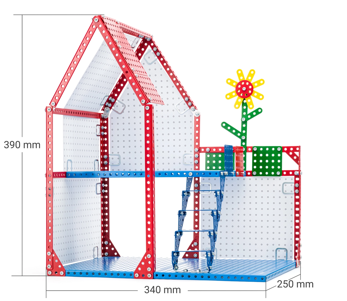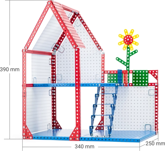 Postavte deťom realistický dvojposchodový domček pre bábiky z legendárnej českej stavebnice MERKUR. Kovové diely sa ľahko prepájajú pomocou skrutiek a matíc, takže malí stavitelia trénujú zručnosť, priestorovú predstavivosť a technické zručnosti. Hotový model ponúka schodisko na druhé poschodie a osem dielikov stien, ktoré si môžu deti vlastnoručne pomaľovať.