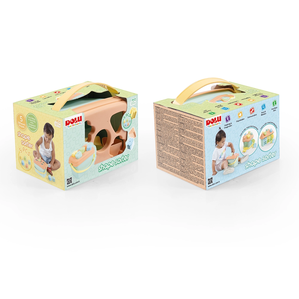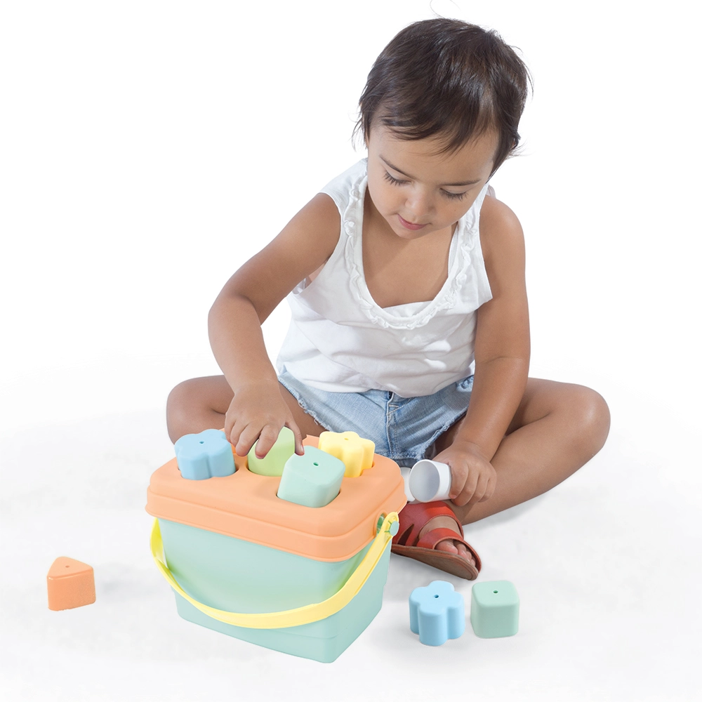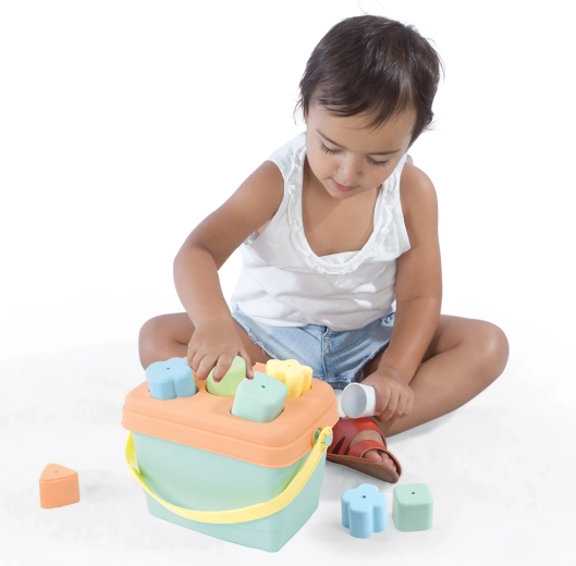 Deti vhadzujú tvary do zodpovedajúcich otvorov, čím si precvičujú jemnú motoriku, trpezlivosť a logické uvažovanie. Praktické ucho uľahčí prenášanie a všetky dieliky možno po hre uložiť späť do kýblika – žiaden neporiadok a všetko vždy poruke.