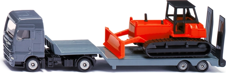 Súprava je ideálna na simuláciu prepravy ťažkých strojov na stavbu. Gumové pneumatiky sa starajú o stabilitu a tichý, plynulý pohyb. Buldozér je vybavený detailnou lyžicou a robustnou konštrukciou, takže ľahko doplní vaše staveniskové scény. Balené v darčekovej krabičke – skvelý tip na darček pre deti od 3 rokov aj pre zberateľov.