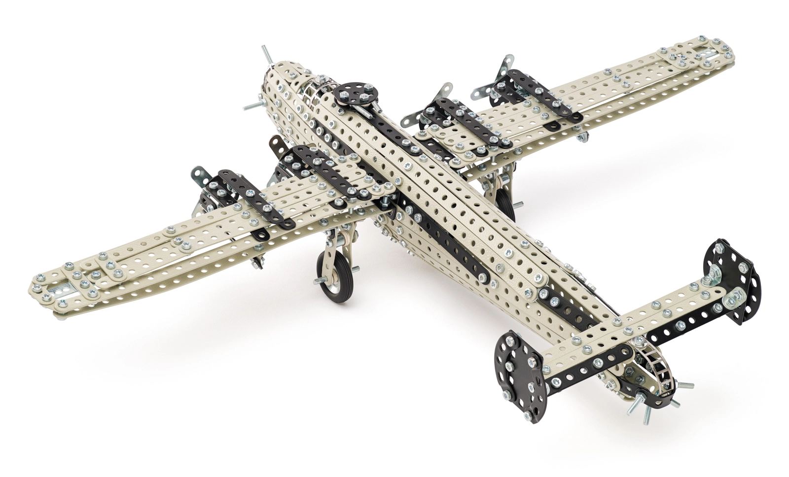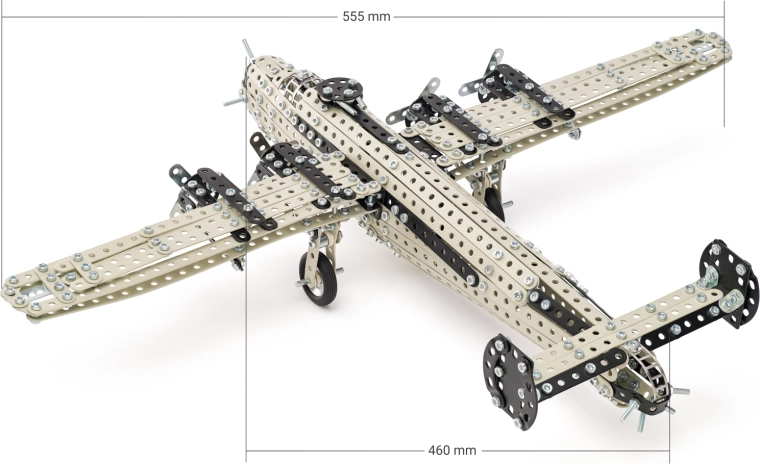 Perforované pásiky, plechy a spojovací materiál vytvárajú pevný model s funkčnými detailmi podvozku a vrtúľ. Ideálne na stavanie aj vystavenie.