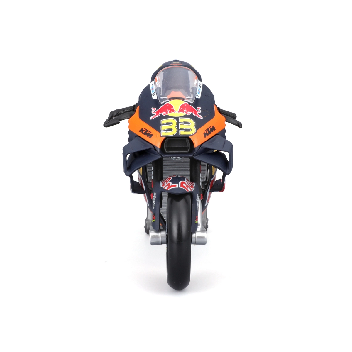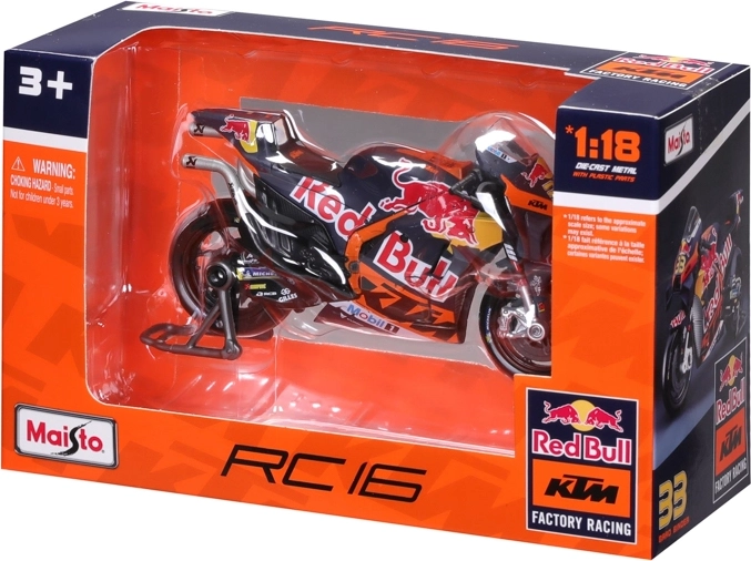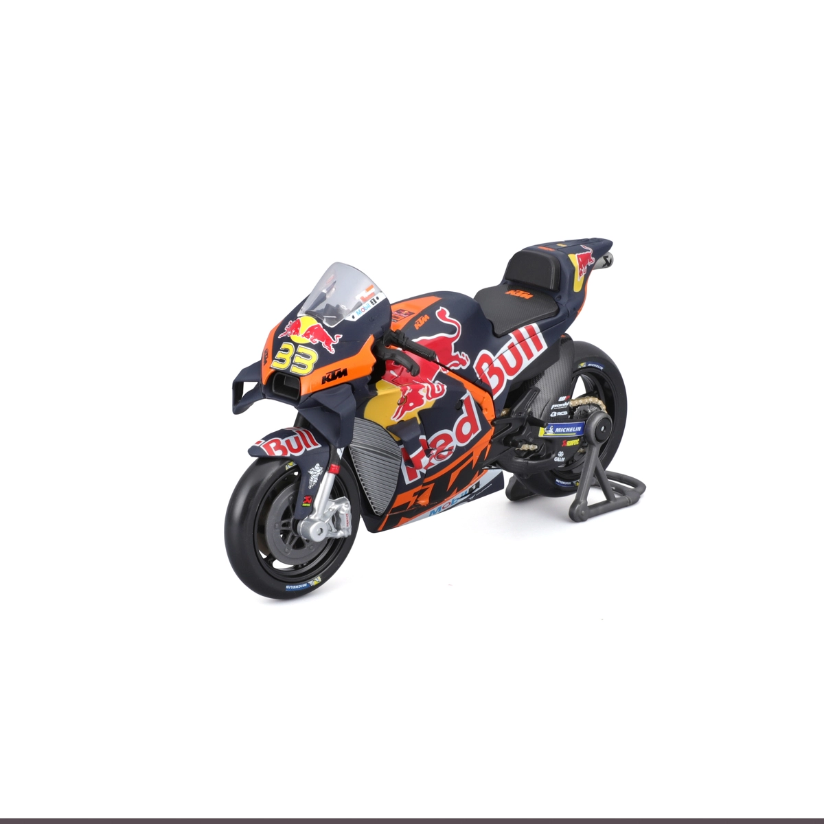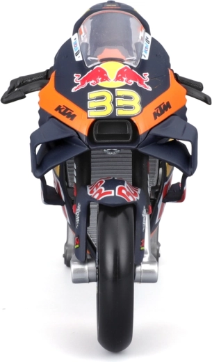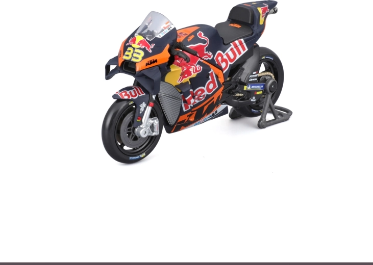 Vďaka otočným kolesám, detailom ako brzdové kotúče, výfuk, riadidlá a priehľadné čelné plexi pôsobí model maximálne realisticky. Súčasťou je aj paddock stojan pre stabilné vystavenie. Oficiálna licencia zaručuje presné farby a grafiku tímu RED BULL KTM s číslom jazdca 33.