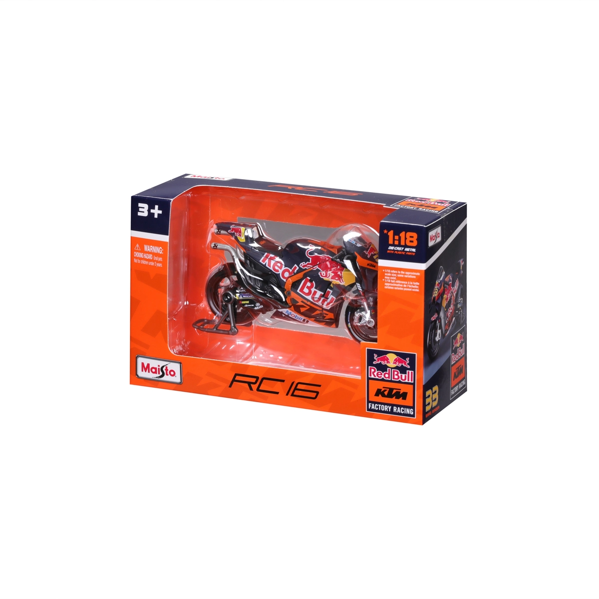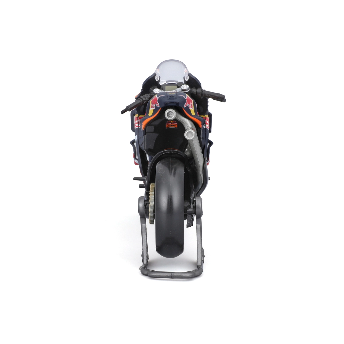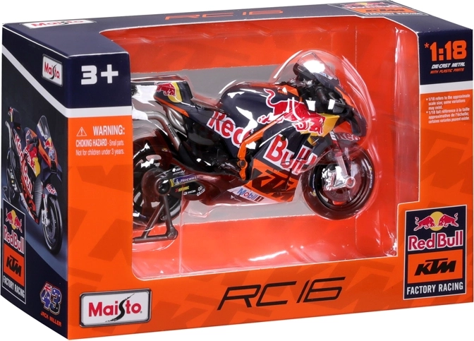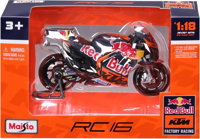 Vďaka otočným kolesám, detailom ako brzdové kotúče, výfuk, riadidlá a priehľadné čelné plexi pôsobí model maximálne realisticky. Súčasťou je aj paddock stojan pre stabilné vystavenie. Oficiálna licencia zaručuje presné farby a grafiku tímu RED BULL KTM s číslom jazdca 33.