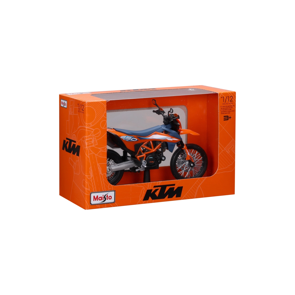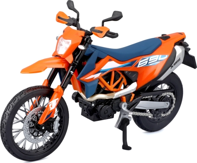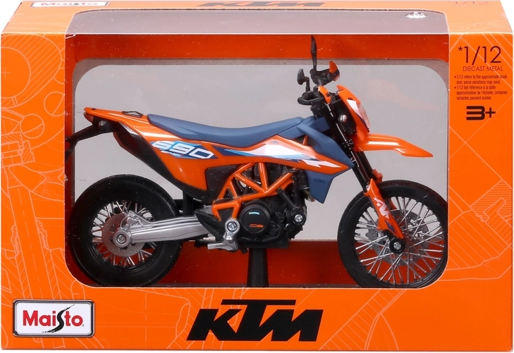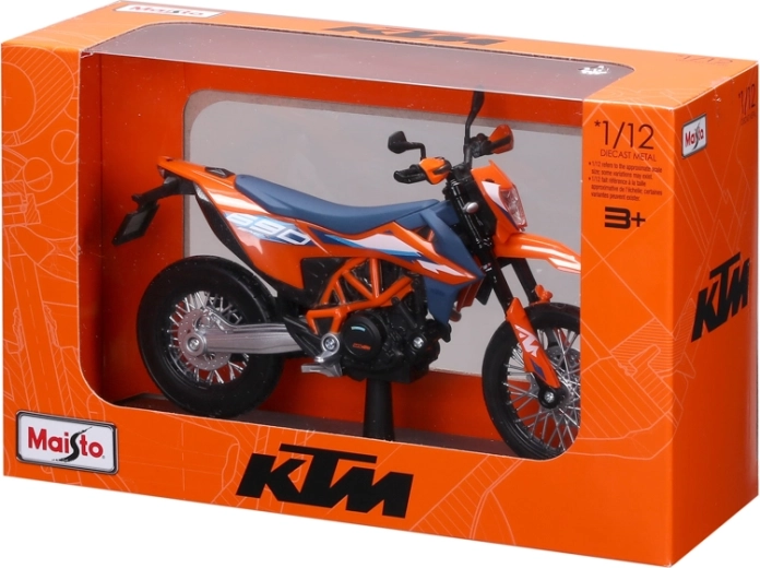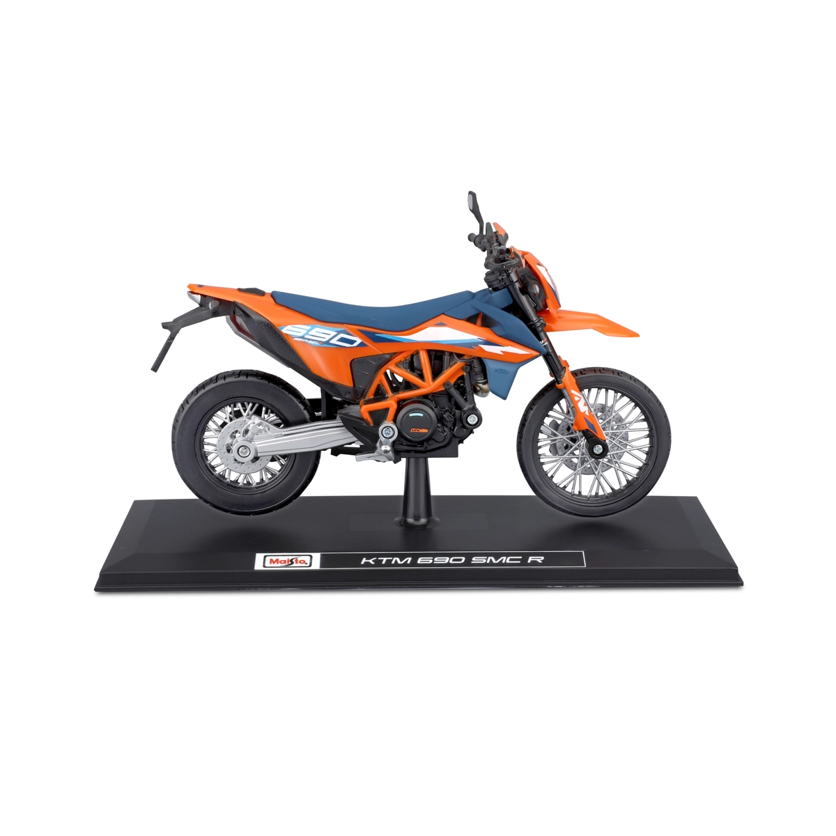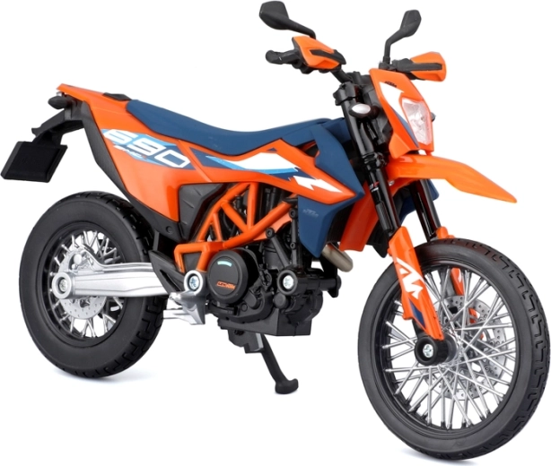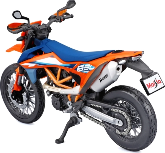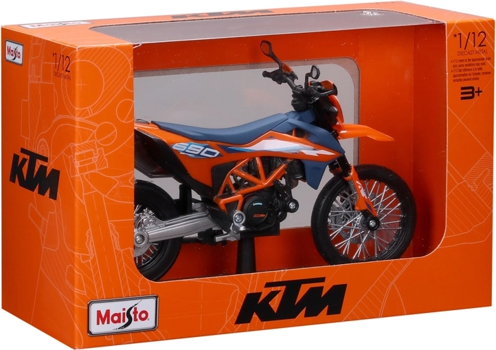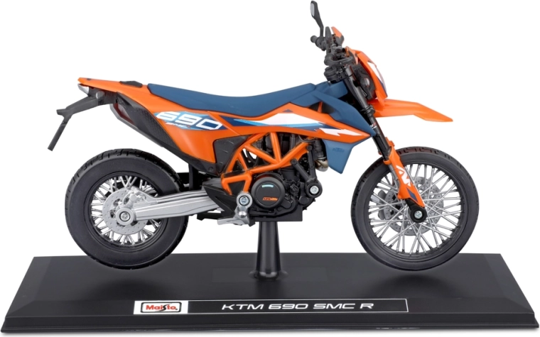 Detailný zberateľský model motocyklu KTM 690 SMC R (2023) v mierke 1:12 od značky Maisto. Ponúka kovové spracovanie s plastovými doplnkami, odpruženú zadnú nápravu, pohyblivý bočný stojan a voľne otočné kolesá pre realistické vystavenie aj hranie.