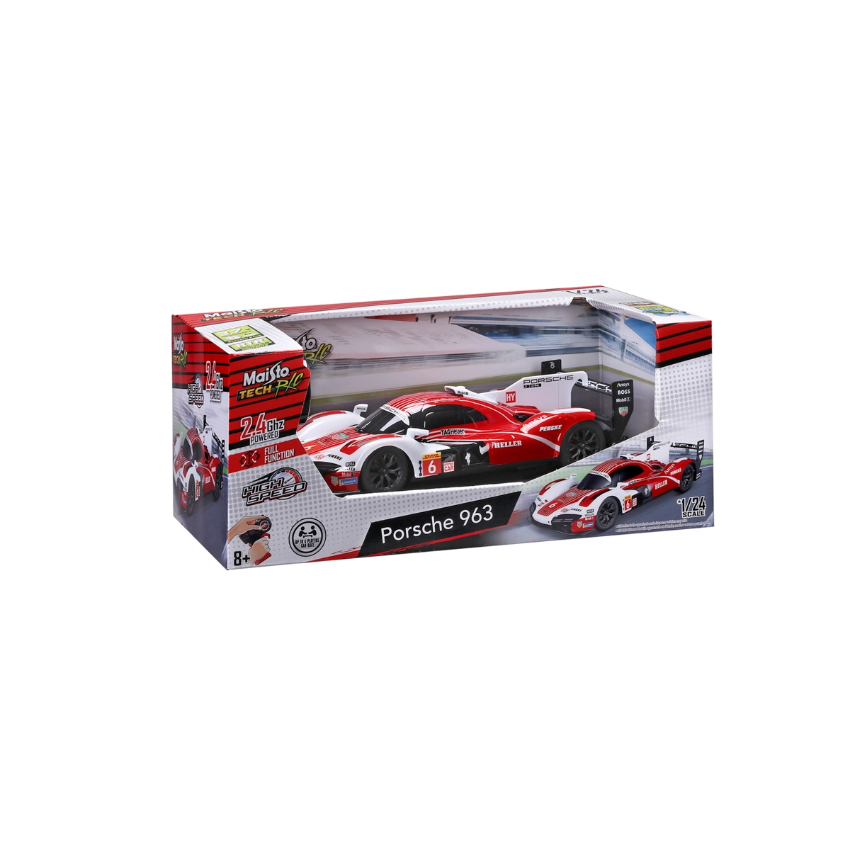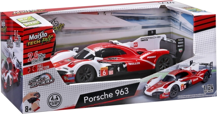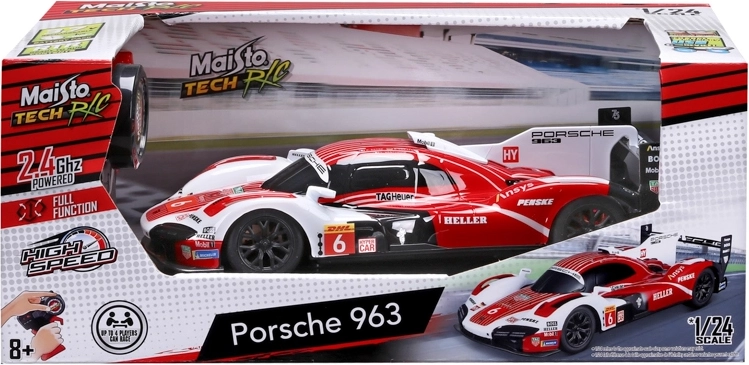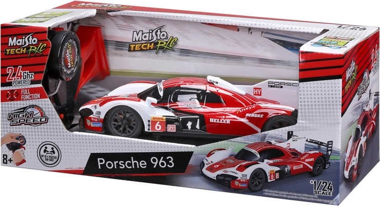 Rýchly a realistický RC model PORSCHE 963 v mierke 1:24 pre domáce aj vonkajšie preteky. 2,4 GHz pre stabilný signál, možnosť jazdy až 4 hráčov súčasne, dosah 35 m. Integrovaná nabíjateľná Li‑ion batéria s USB nabíjaním, ergonomický ovládač Mini‑Pro. Plne licencovaný dizajn so závodnými detailmi, pripravené na jazdu vrátane batérií do ovládača.