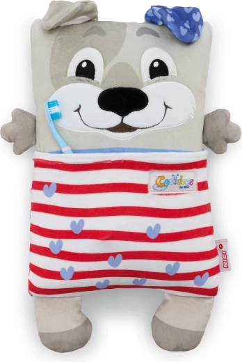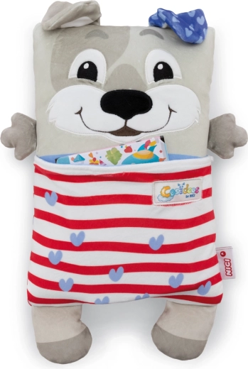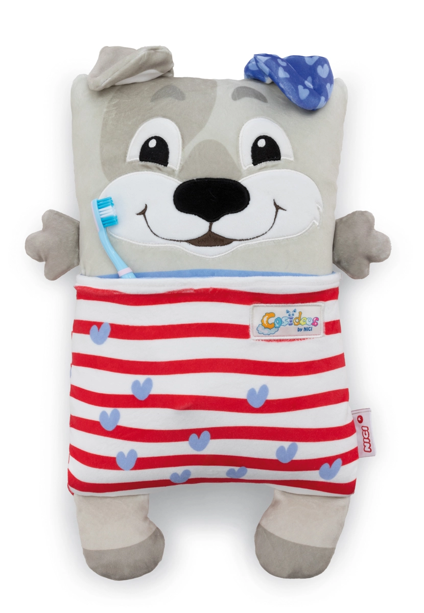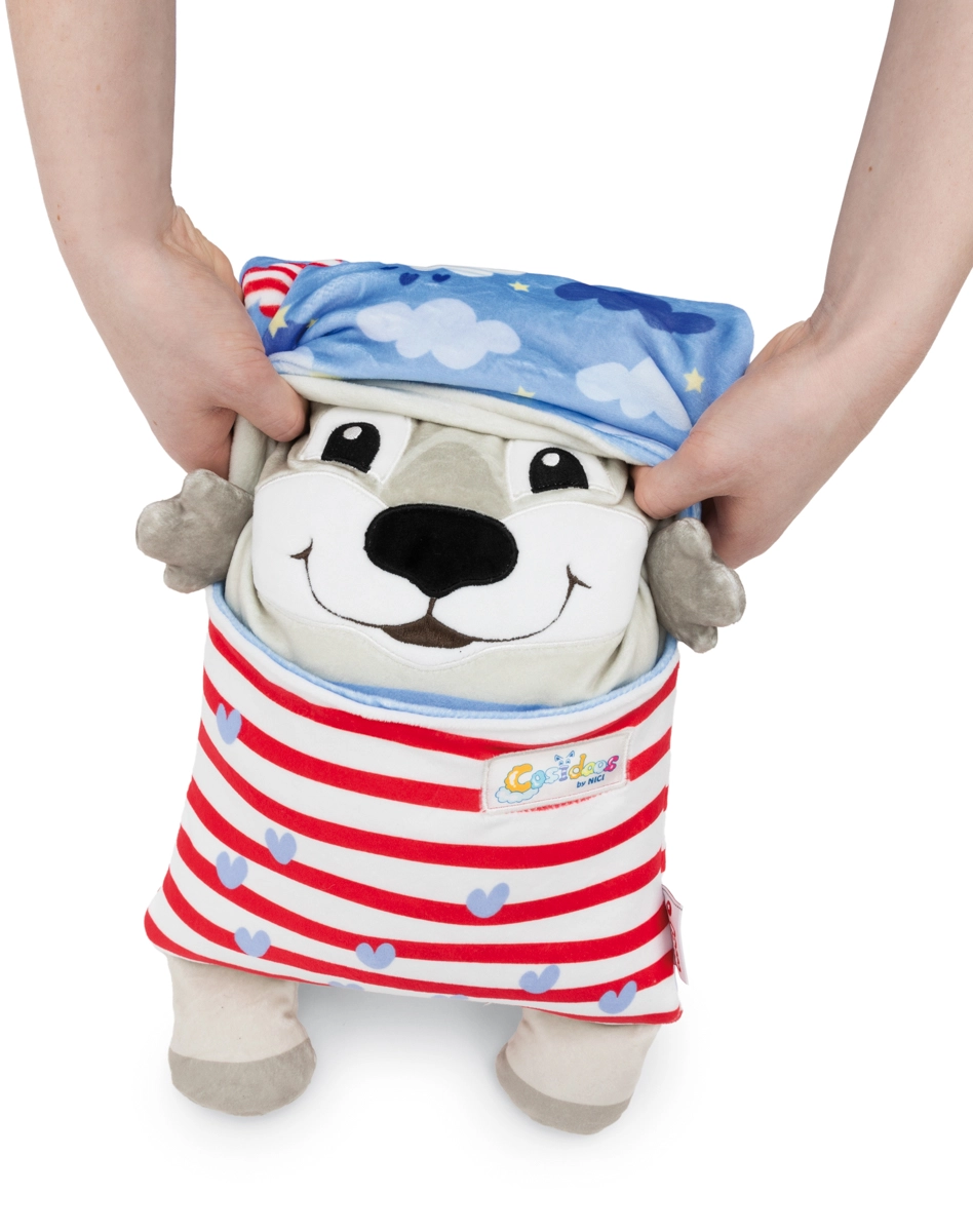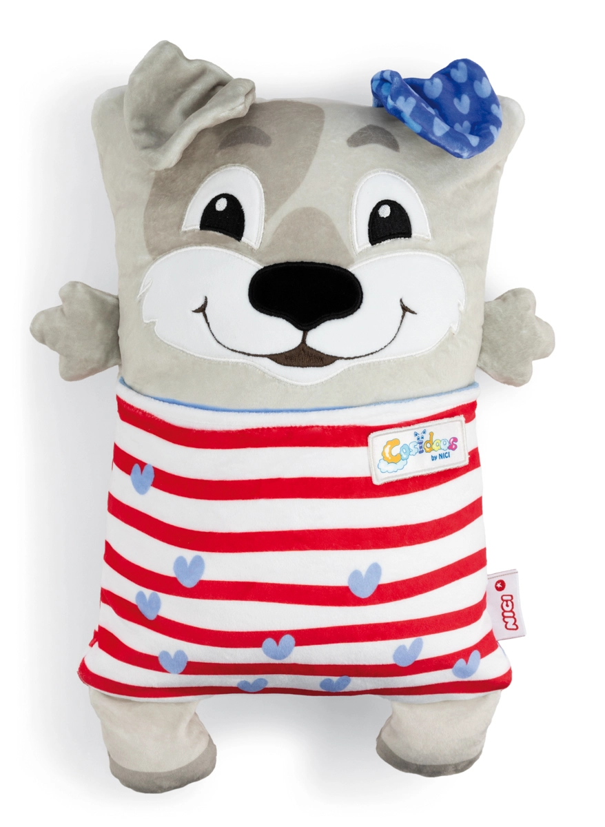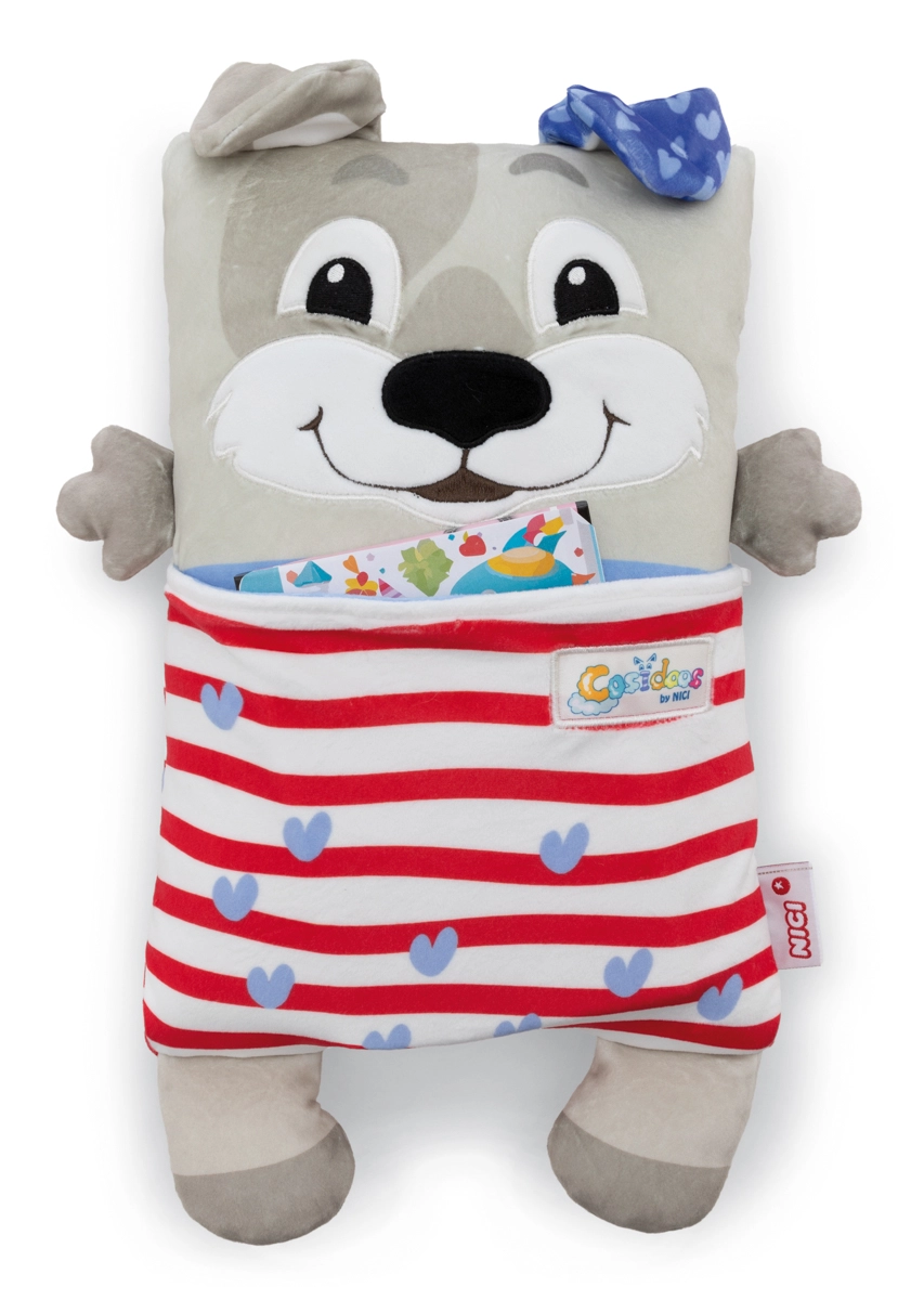 Objavte kúzlo plynulého prechodu medzi hrou a oddychom. NICI Cosidoos je hebký psík so sivým telíčkom a modrým uškom, ktorý sa jediným prevrátením zmení z hravého spoločníka na mäkučký vankúšik s nočným motívom. Deti si zamilujú jeho milý výraz, nežné materiály a upokojujúce farby s obláčikmi, hviezdami a mesiačikom.