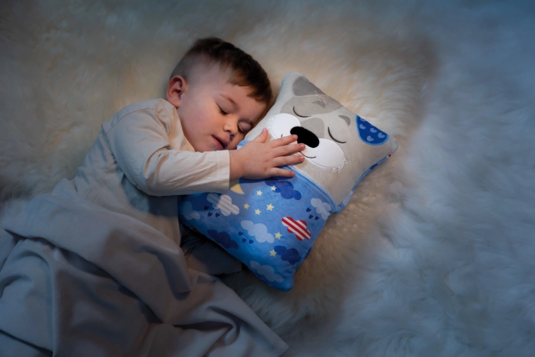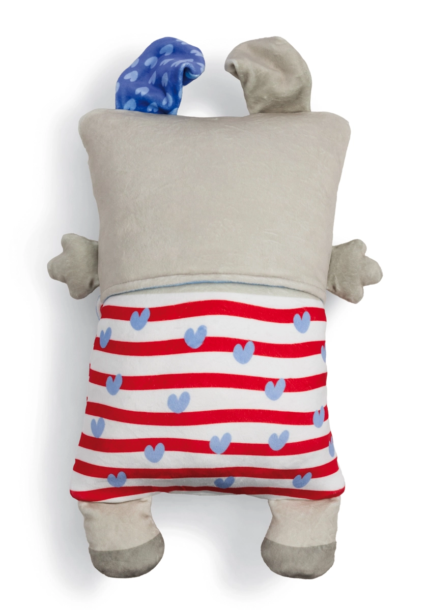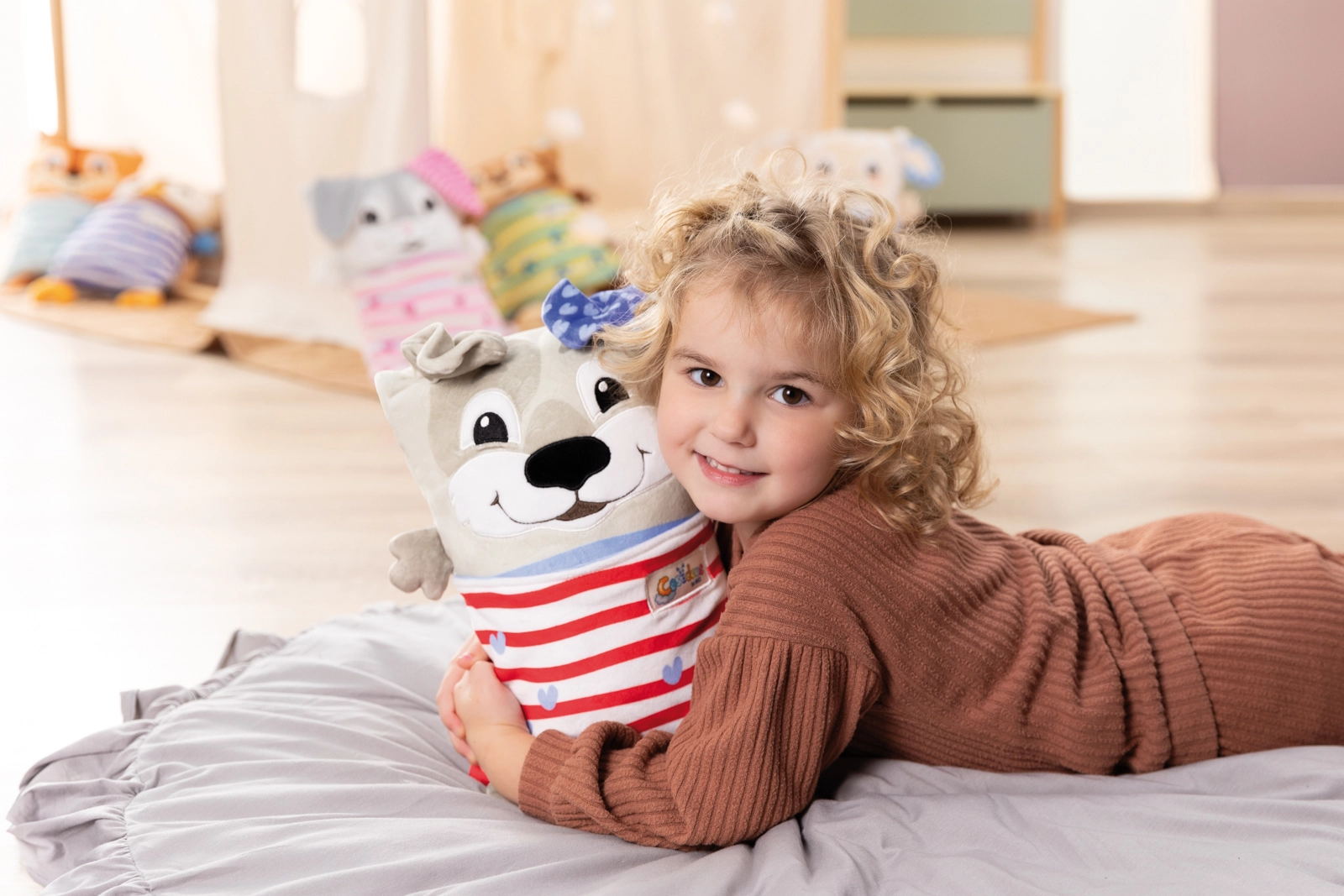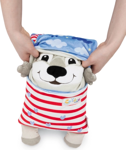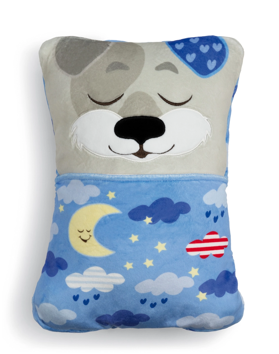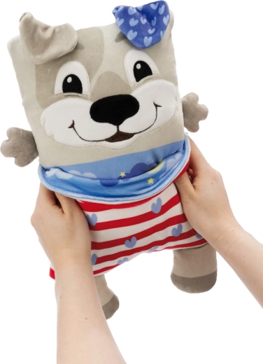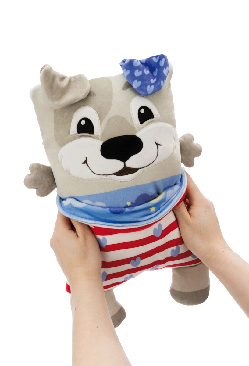 Jednoduchým prevrátením premeníte veselého psíka na upokojujúci nočný vankúšik s obláčikmi, hviezdami a mesiačikom. Perfektný rituál pre ľahšie zaspávanie.