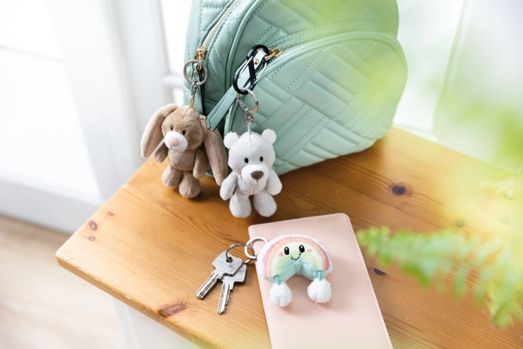 Kovový krúžok a karabínka zaistia ľahké pripnutie na kľúče, batoh aj kabelku. Prívesok drží spoľahlivo a bezpečne.