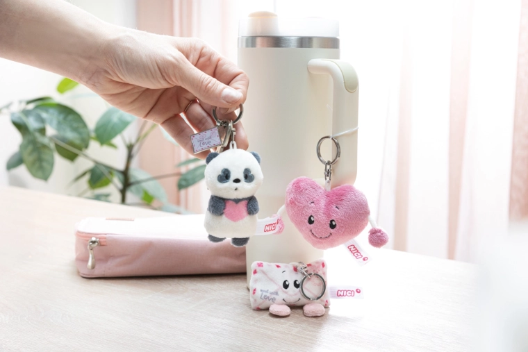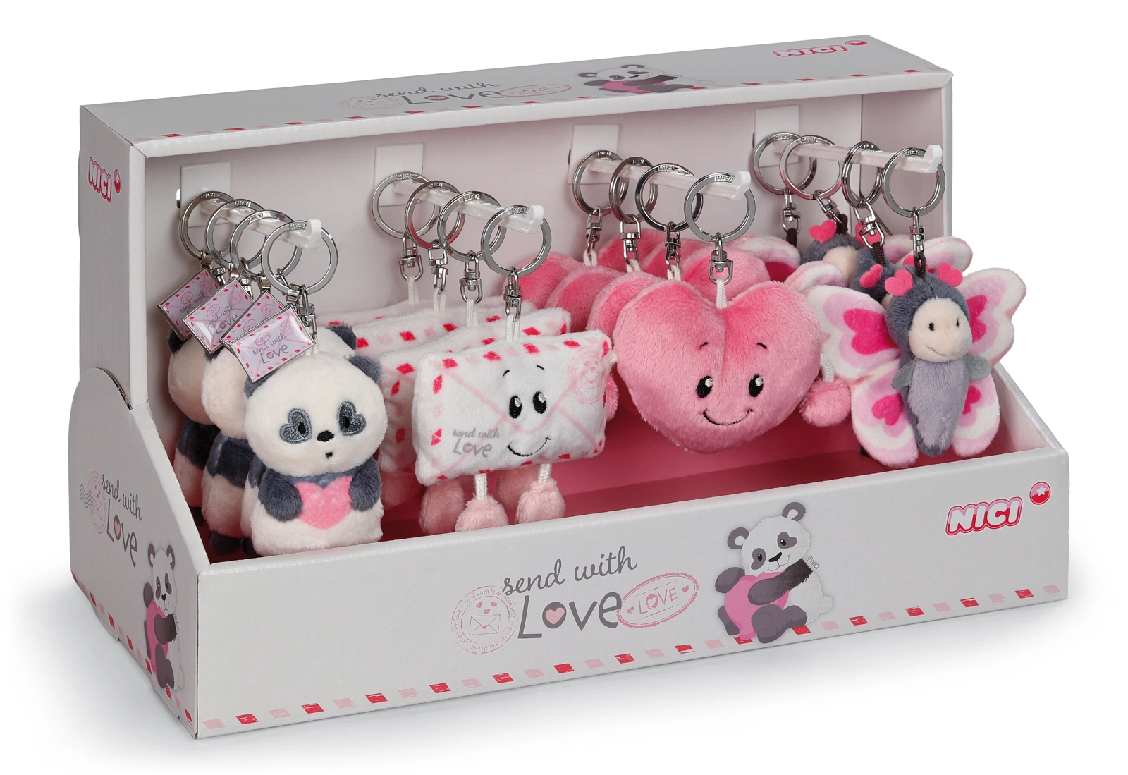 Plne naskladnený displej NICI Love prináša očarujúce kľúčenky v podobe pandy, srdiečka, listu a motýlika. Každý prívesok je vyrobený z jemného plyšu a doplnený kovovým krúžkom (niektoré varianty aj karabínkou) na jednoduché a bezpečné pripnutie. Vďaka kompaktnej veľkosti cca 6–8 cm sa kľúčenky skvele hodia na kľúče, aktovku aj kabelku.