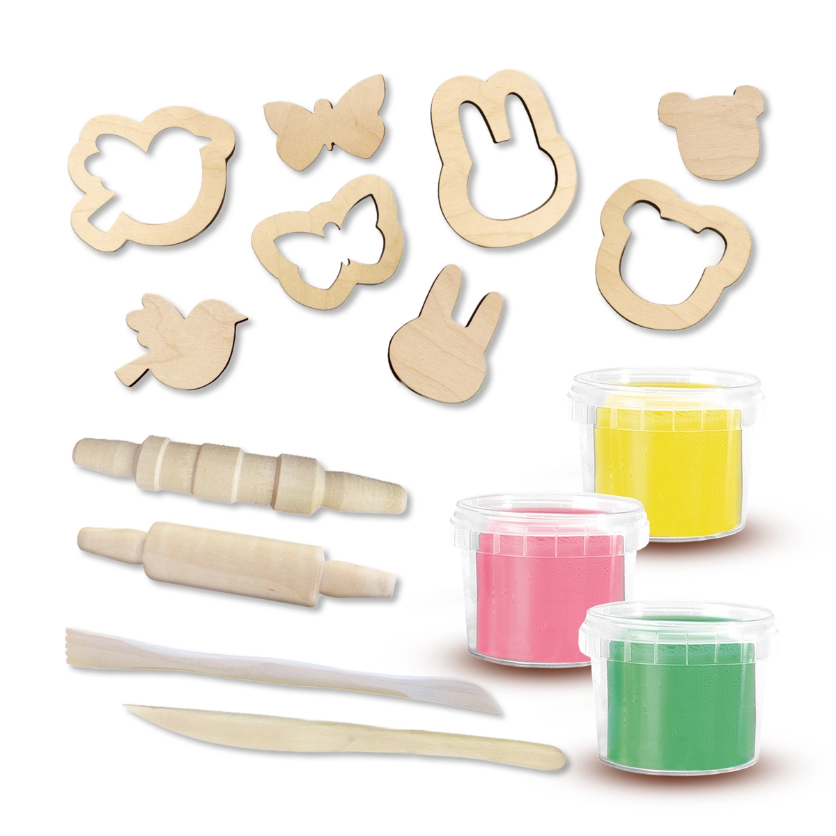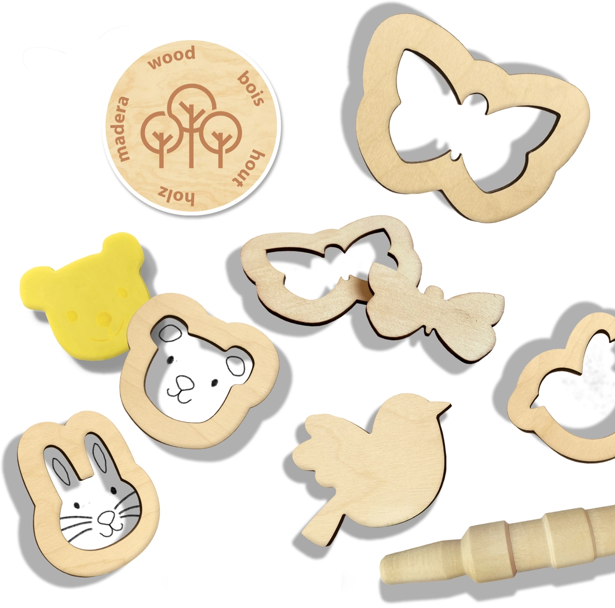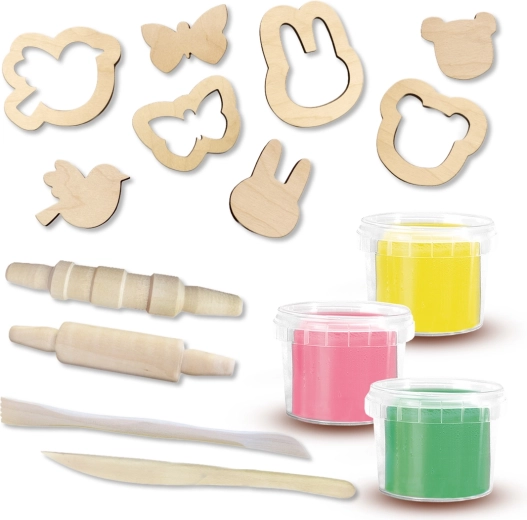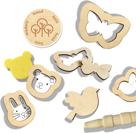 - Bohaté príslušenstvo: 2 drevené valčeky (hladký a s vrúbkami), 2 drevené modelovacie nože (plochý a s vrúbkami), 4 vykrajovacie a 4 vytláčacie formičky.
