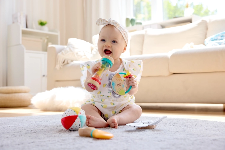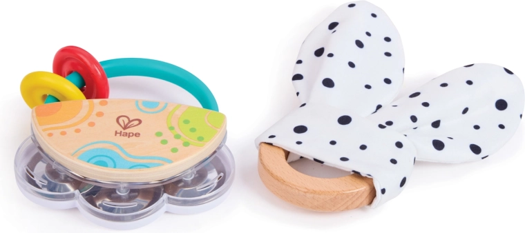 - Tamburína, hrkálka/maraca, dažďový valec (rainmaker), mäkká látková loptička, drevené hryzátko s látkovými uškami