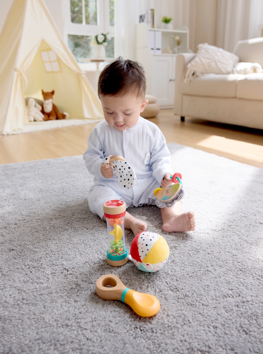 V balení nájdete tamburínu, maracu/hrkálku, dažďový valec, mäkkú látkovú loptičku a drevené hryzátko s látkovými uškami. Každý prvok prináša iný zvuk a textúru pre bohaté zmyslové zážitky a motivuje deti k pohybu, triaseniu, stláčaniu aj kotúľaniu.