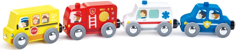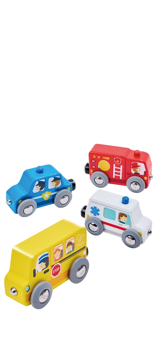Objavte zábavnú sadu mestských vozidiel 4 v 1, ktorá rozšíri každý drevený vláčikodráhový svet. Obsahuje školský autobus, hasičské vozidlo, policajné auto a ambulanciu. Vozidlá sú kompatibilné so všetkými vláčikovými sadami HAPE a vďaka magnetickým spojom ich ľahko pripojíte k ľubovoľnej súprave. Vyrobené z kvalitného FSC dreva, ideálne pre deti od 18 mesiacov.