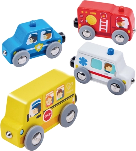 Táto sada prináša do hry realistické mestské scenáre a podporuje detskú fantáziu. Štyri farebne odlíšené vozidlá – žltý školský autobus, červené hasičské vozidlo, modré policajné auto a biela sanitka – pomôžu deťom spoznávať farby, typy vozidiel aj ich funkcie v meste.