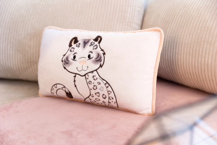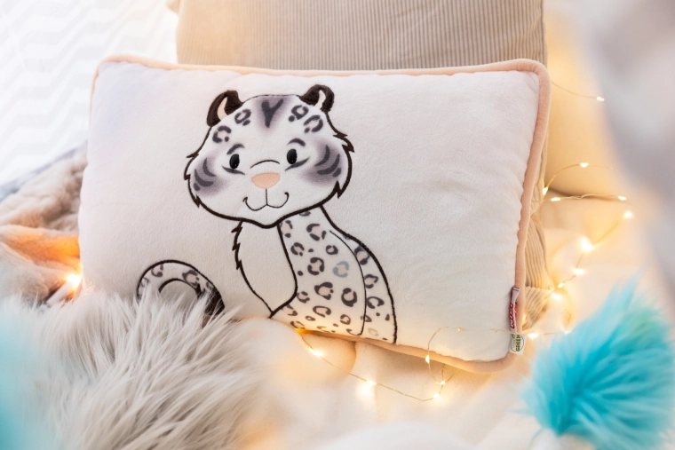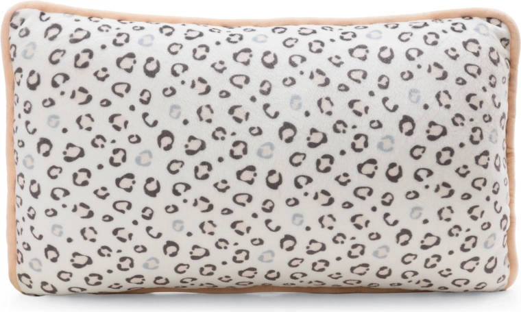 Prednú stranu zdobí roztomilá aplikácia snežného leoparda, zadná strana má štýlový leopardí vzor – ideálne na dekor aj odpočinok.