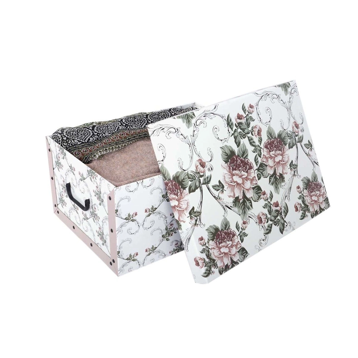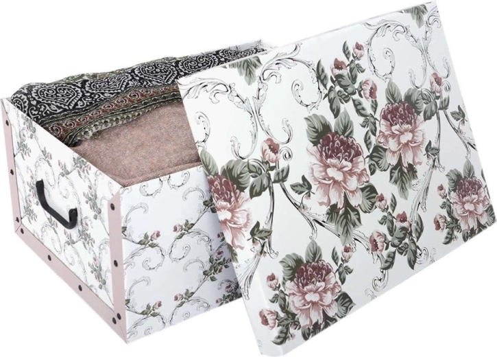 Hľadáte krásne a spoľahlivé uloženie oblečenia, dokumentov či doplnkov? Krabica MAXI v dekore Barok Antik spája nadčasový vzhľad s praktickými detailmi. Vďaka pevnej kašírovanej lepenkovej konštrukcii drží svoj tvar, ľahko sa skladá a prenáša vďaka integrovaným úchytom.