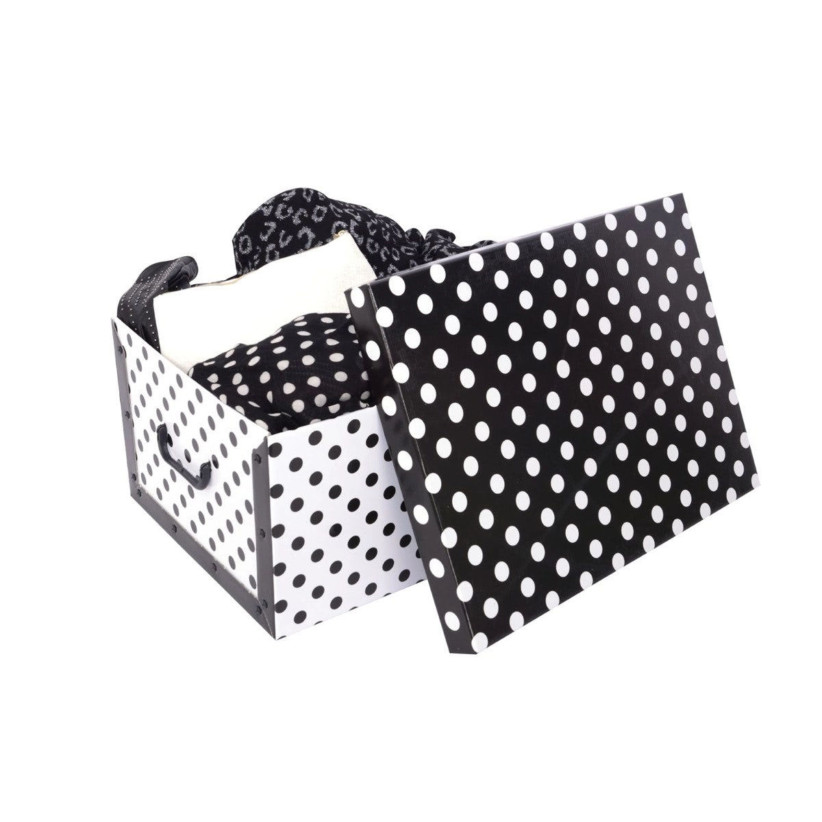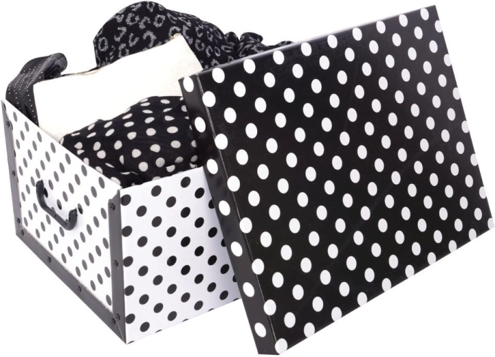 Štýlová úložná krabica MAXI v dizajne biele bodky na čiernom podklade ponúka elegantný vzhľad, pevnú konštrukciu a je vyrobená zo 100 % recyklovaného kartónu. Ľahko sa skladá bez náradia, pýši sa talianskou kvalitou a certifikáciou FSC a PEFC pre šetrnosť k prírode aj zdraviu.