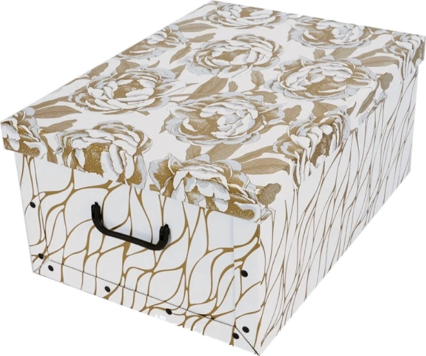 Oživte svoj interiér elegantnou úložnou krabicou MAXI so vzorom zlatých pivónií. Spája nadčasový dizajn s udržateľnosťou – je vyrobená zo 100 % recyklovaného kartónu a pochádza z talianskej výroby, ktorá zaručuje precízne spracovanie a dlhú životnosť. Vďaka prepracovanej konštrukcii ju zložíte rýchlo a bez použitia náradia.
