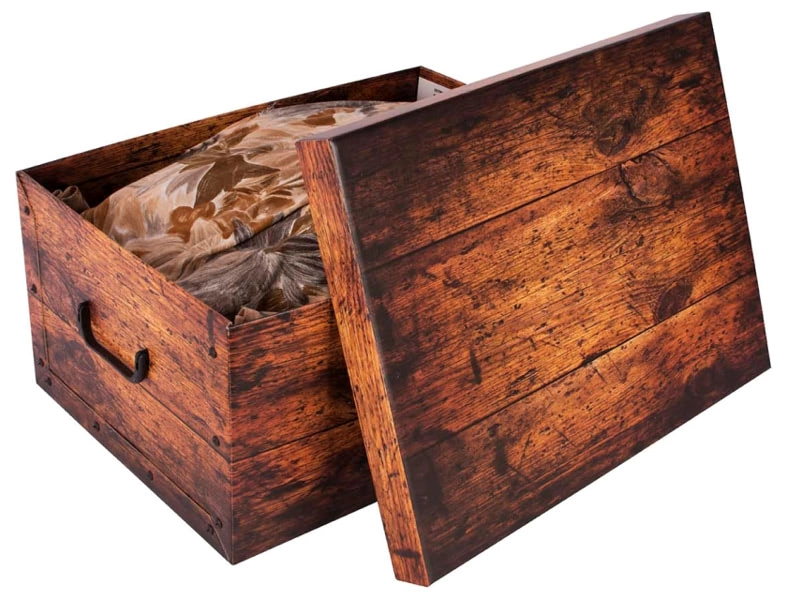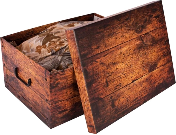 Štýlový úložný box v dekore rustikálneho dreva z pevného, kašírovaného kartónu zo 100% recyklovaných materiálov. Vďaka umývateľnému povrchu sa ľahko udržiava, má pevné bočné steny spojené nitmi, dvojité horné hrany a praktické úchyty na pohodlné prenášanie. Jednoduchá a rýchla montáž, veko je pripravené na okamžité použitie. Vyrobené v Taliansku.
