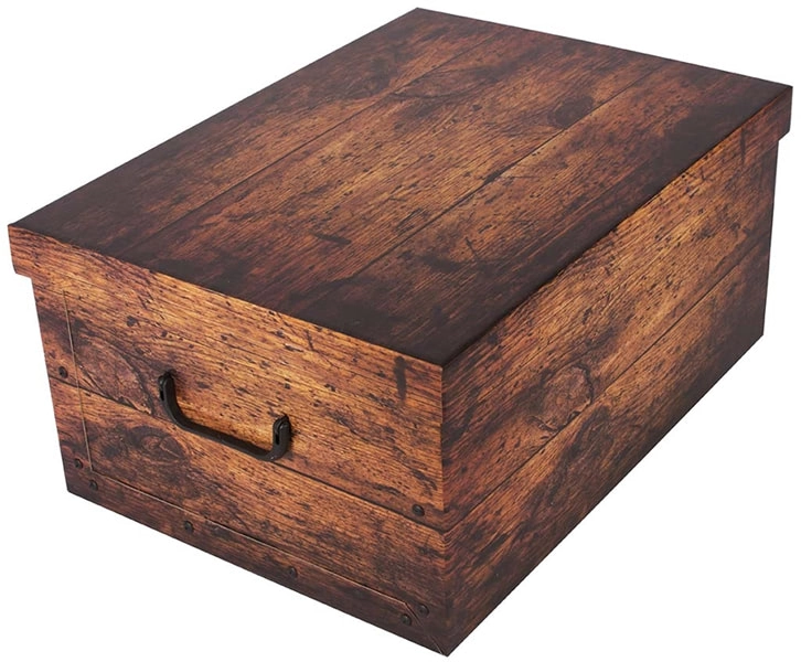 Elegantná archivačná a dekoračná krabica v dizajne hnedého dreva je ideálna na prehľadné uloženie dokumentov, fotografií, kníh, hračiek, odevov aj doplnkov. Ľahká, ale odolná konštrukcia z kašírovaného kartónu s leskom zaisťuje dlhú životnosť a jednoduchú údržbu – povrch možno utrieť vlhkou handričkou.